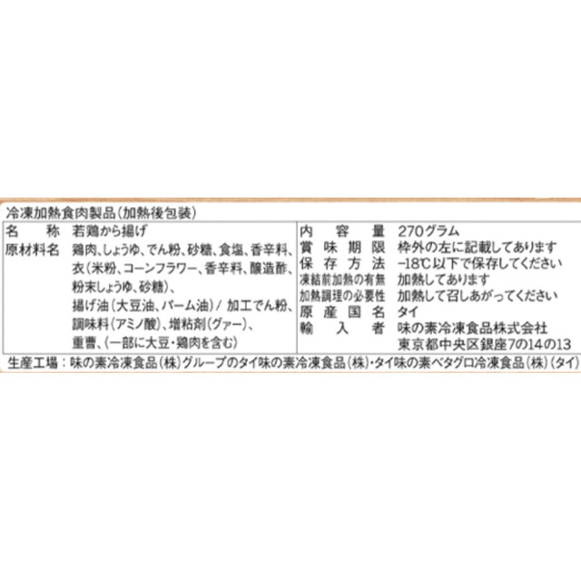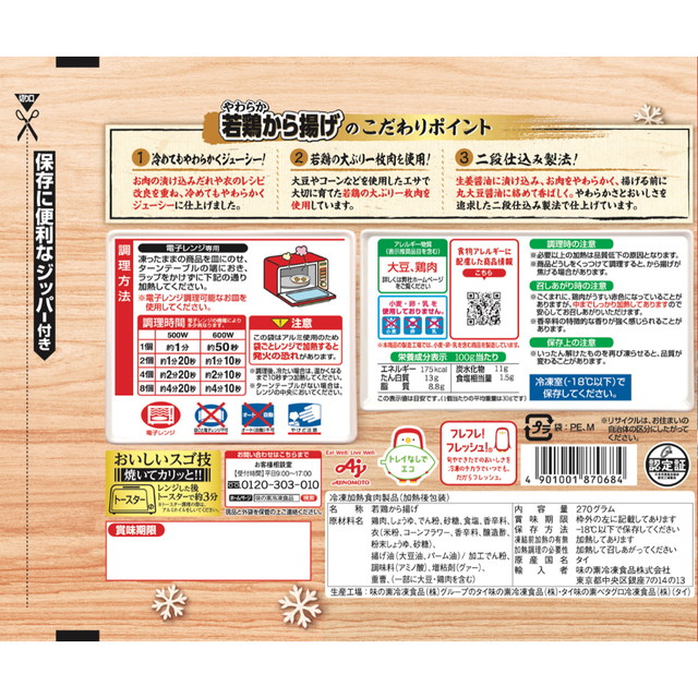 商品名 [冷凍食品] 味の素 冷凍やわらか若鶏から揚げボリュームパック 270g×4袋 容量 270g×4袋 原材料名 鶏肉、しょうゆ、でん粉、砂糖、食塩、香辛料、衣(米粉、コーンフラワー、香辛料、醸造酢、粉末しょうゆ、砂糖)、揚げ油(大豆油、パーム油)/ 加工でん粉、調味料(アミノ酸)、増粘剤(グァー)、重曹、(一部に大豆・鶏肉を含む) アレルギー特定原材料 − 賞味期限 商品の発送時点で、60日以上あるものをお届けいたします 保存方法 冷凍室(−18℃以下)で保存してください。