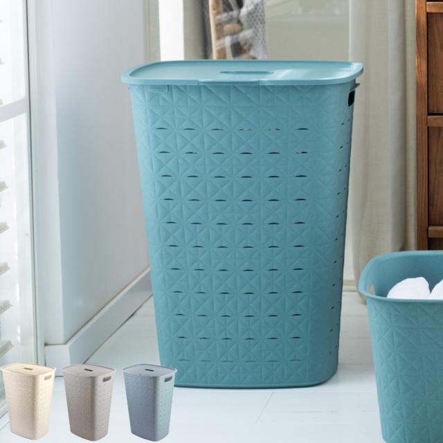 柔らかい樹脂素材で、心地よい感触の「フタ付きランドリーバスケット 56L」です。水に強く、湿気の多い洗面所やランドリールームでの使用に最適です。