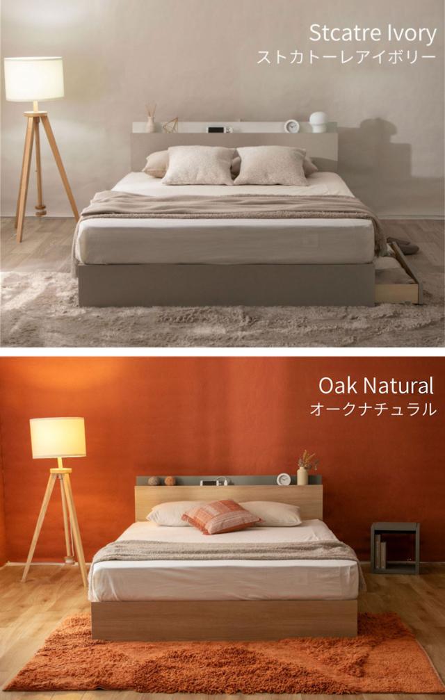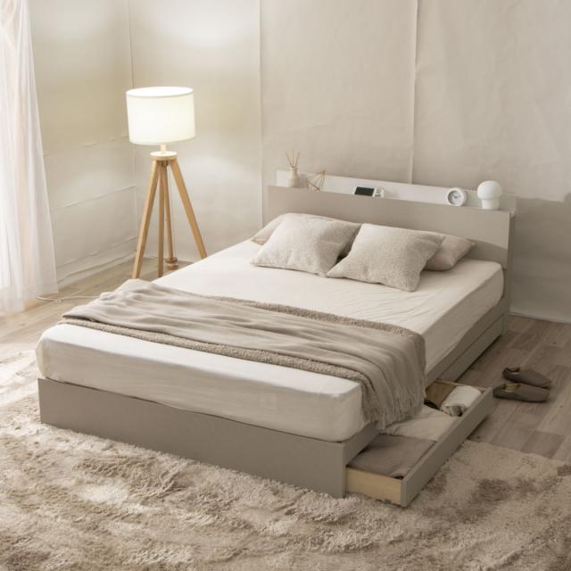 ツートンカラーのヘッドボードが目を惹くデザインのベッドフレームです。大容量の収納スペースやコンセント付きの宮棚など、機能面も充実しています。贅沢な夜を彩る、ワンランク上のおしゃれな眠りをお楽しみください。