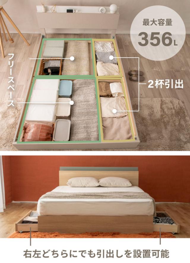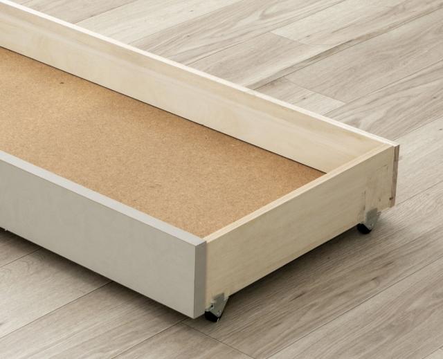 床下には洋服などを収納できる引出しが2杯付いています。引出しの奥は、出番の少ないシーズン物や、小物類を入れたかごを収納できるフリースペース。引出しは、ベッドの両サイドどちら側でも取り付けられるので、お部屋のレイアウトに合わせてお選びください。