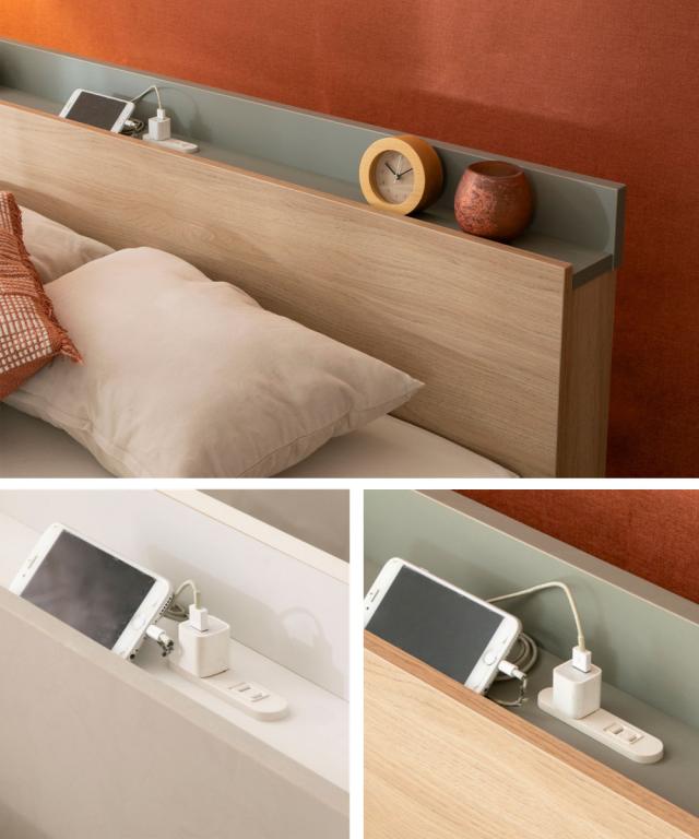 枕元にスマートフォンやメガネなどの小物を置ける宮棚付きです。2口コンセント付きなので、寝ている間にスマートフォンやタブレットの充電も可能です。スライド式なのでホコリが入りにくいのも嬉しいポイントです。