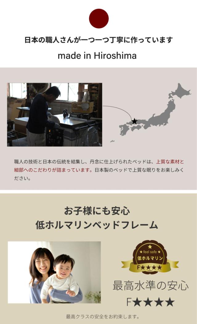 すべてのお客さまに安心して使っていただけるよう、低ホルマリンを証明する「F☆☆☆☆」の部材、塗料を使用しています。国内の工場で1点1点仕上げられた製品です。