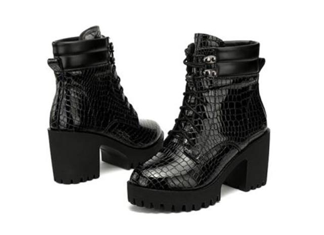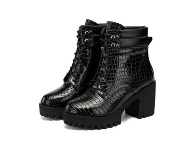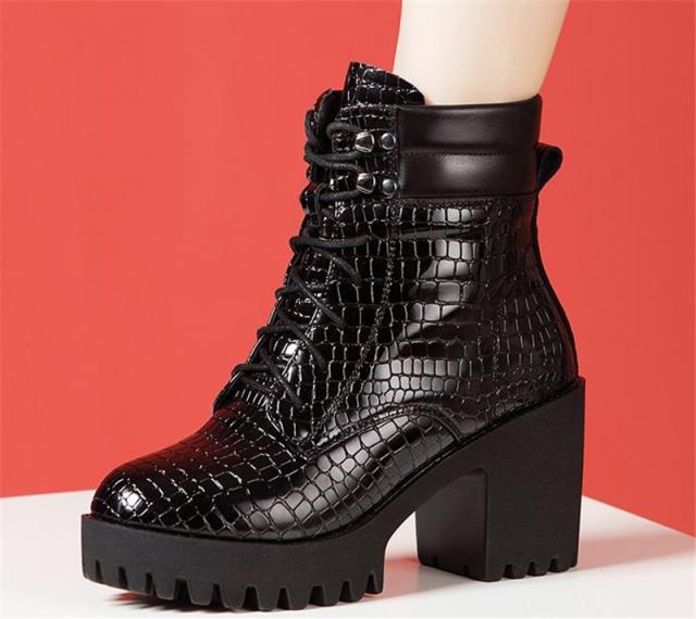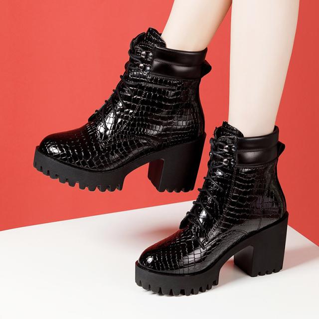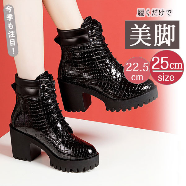 ショートブーツ レディース 編み上げブーツ 靴 太ヒール クロコ型押し ハイヒール カジュアル レースアップブーツ 美脚 大きいサイズ おしゃれ
