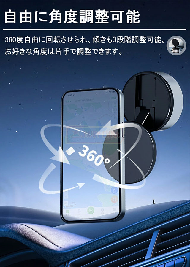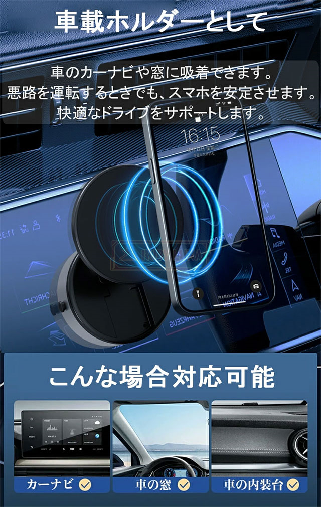 | 【車載ホルダーとして】 | ◆車のカーナビや窓に吸着できます。悪路を運転するときでも、スマホを安定させます。快適なドライブをサポートします。 |