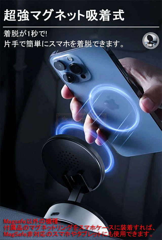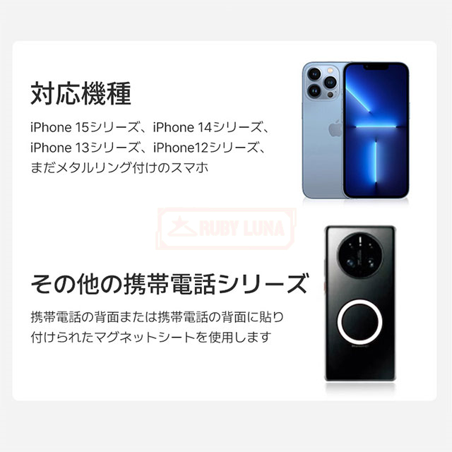 | Magsafe以外の機種: | ◆付属品のマグネットリングをスマホケースに装着すれば、MagSafe非対応のスマホやタブレットにも使用できます。 |