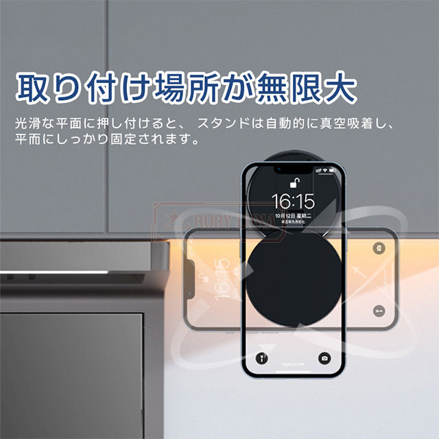 | 【電動真空式だから】 | ◆ツルツルした平面に押し付けると、スタンドは自動的に真空吸着し、平面にしっかり固定されます。 |