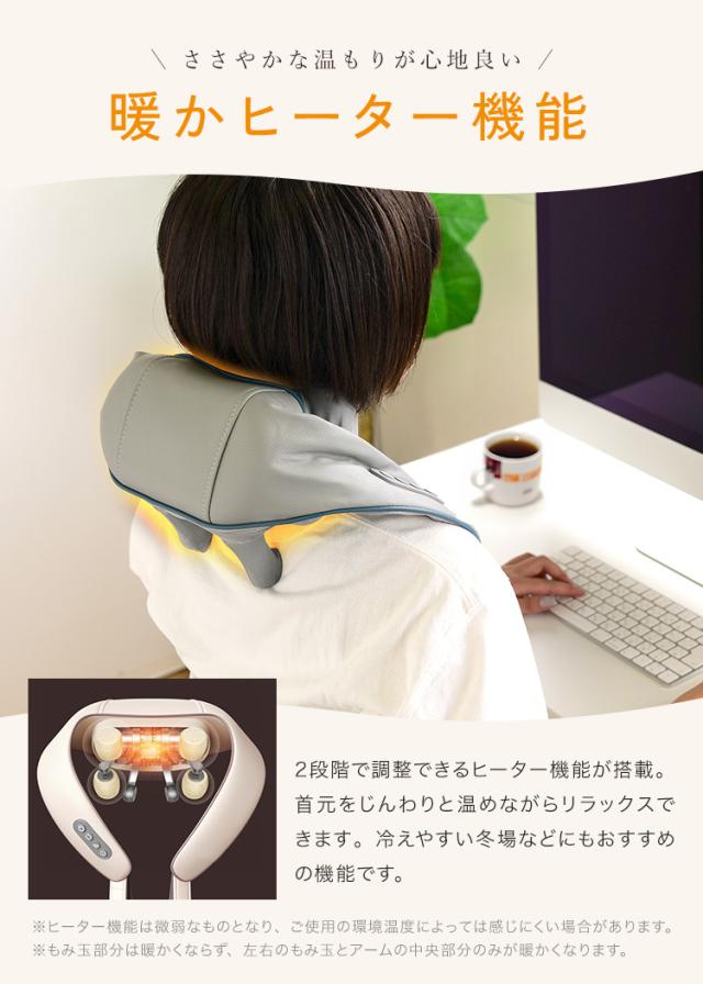 【ヒーター機能搭載】:もみ玉にヒーターが内蔵さており、約44℃に加熱し、あたたかなマッサージをを行ってくれます。リラックスと筋肉のコリをほぐすことに役立ちます。