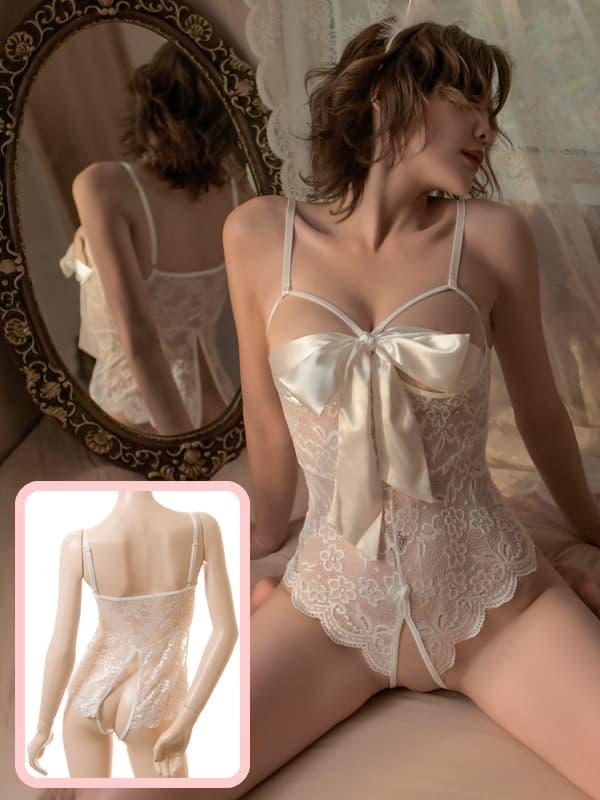 ●商品名:総レース リボンのオープンバスト オープンクロッチ テディ 2414