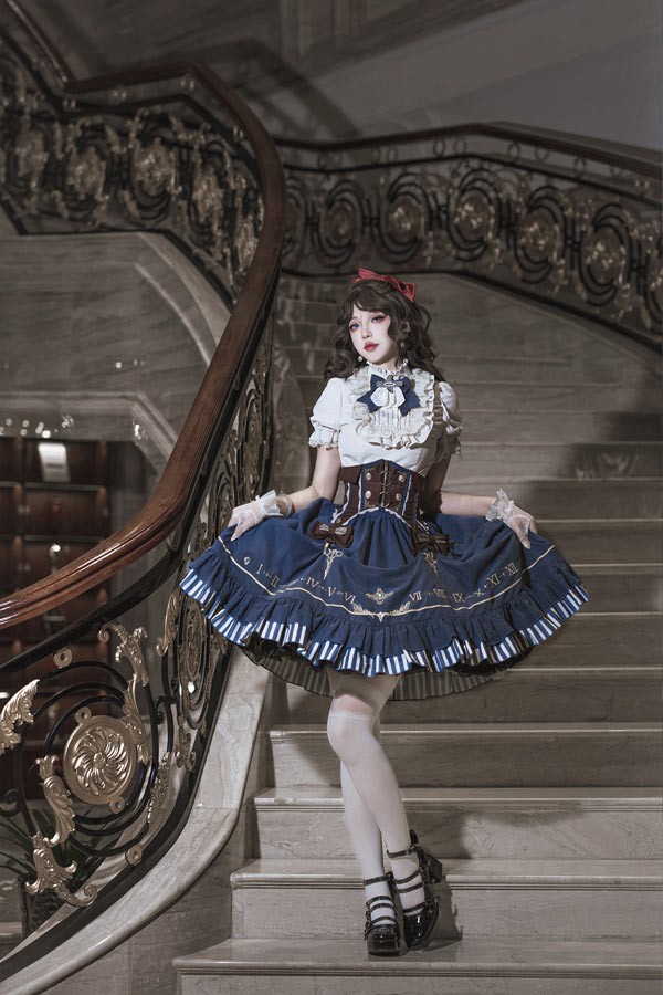 ロリータ スカート 3点セット ストライプ柄 アイドル風 ショート丈 ミニ レディース ゴスロリ ハイウエスト Aライン リボン ロリータファッション レトロ風 暗黒風 ゴシック 夏 半袖 コスチューム コスプレ 衣装 コーディネート 可愛い 仮装 パーティ イベント ステージ 文化祭 学園祭 日常着 お出かけ ブルー da511m4H5