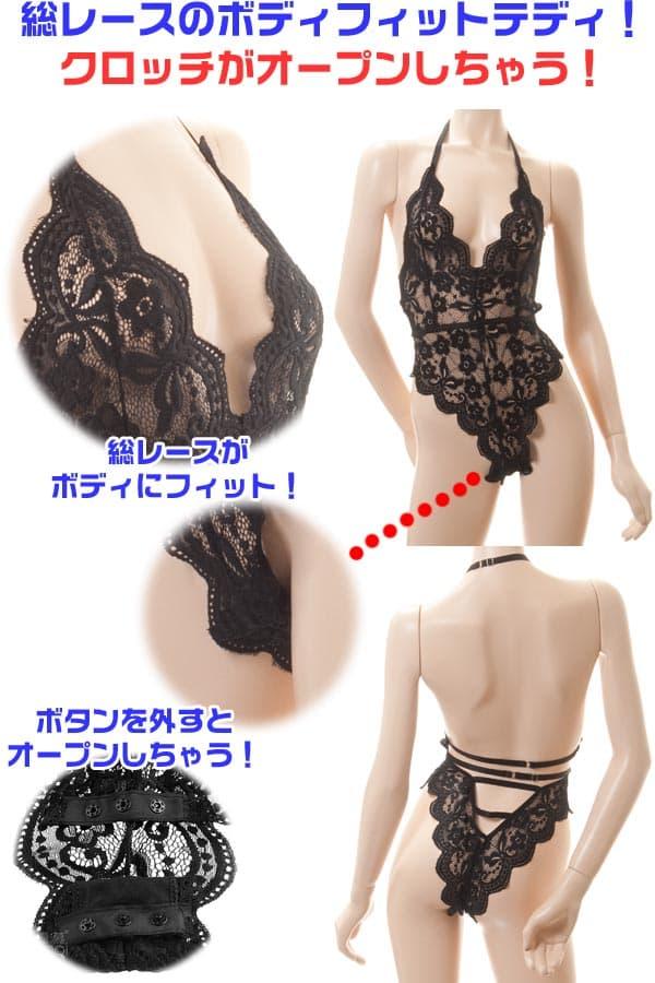 ボタンであいちゃう! 総レース ボディ フィット オープン クロッチ ハイレグ テディ セクシー ランジェリー 下着 穴あき 股割れ 女性 レディース 勝負 過激 グッズ おもちゃ エロ かわ エッチ エロい エッチな sexy
