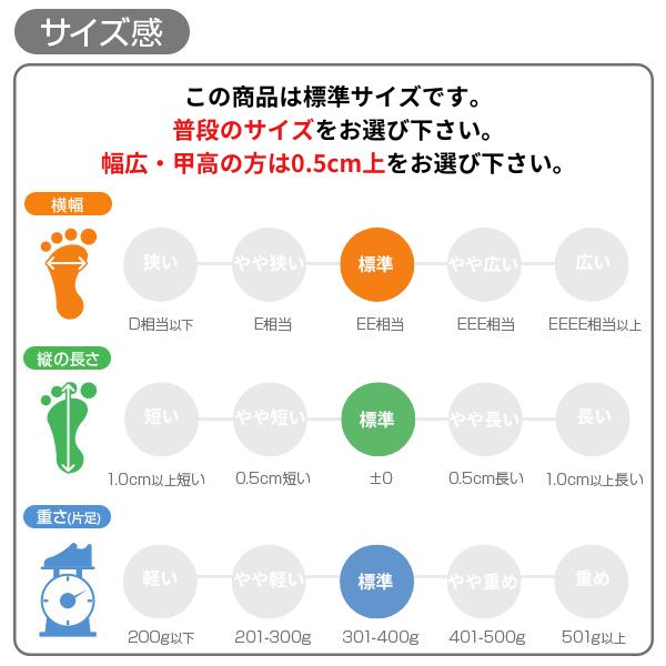 甲高、幅広の方→「0.5cm大きめ」