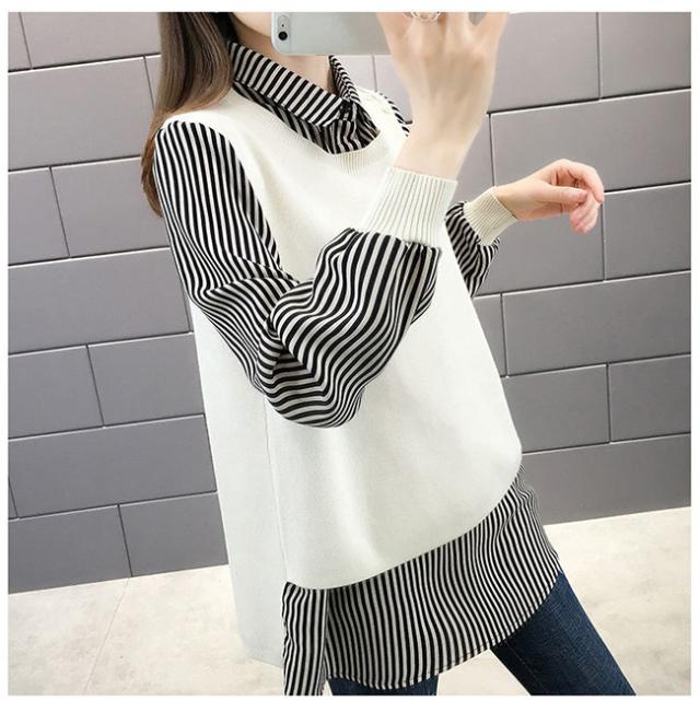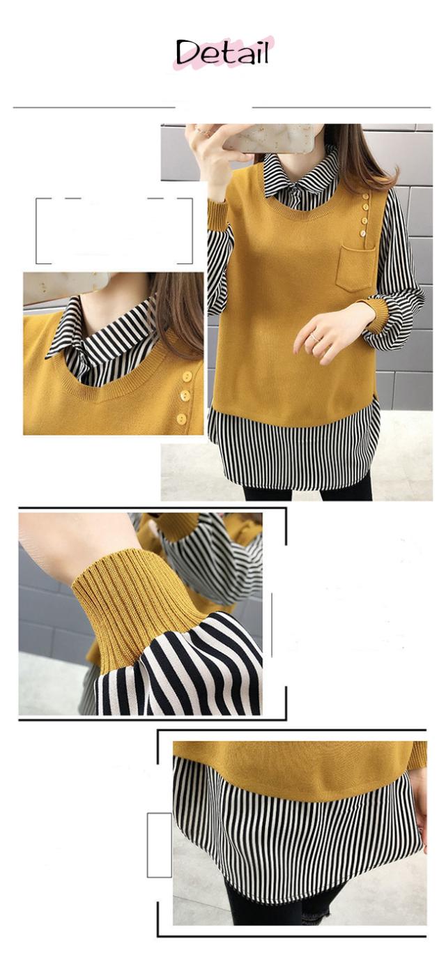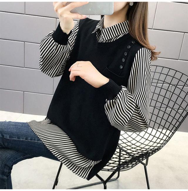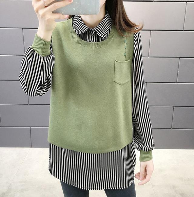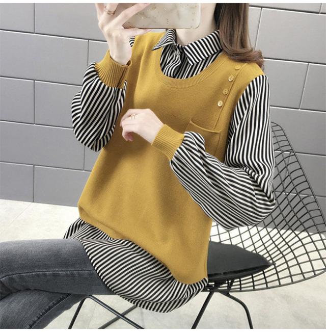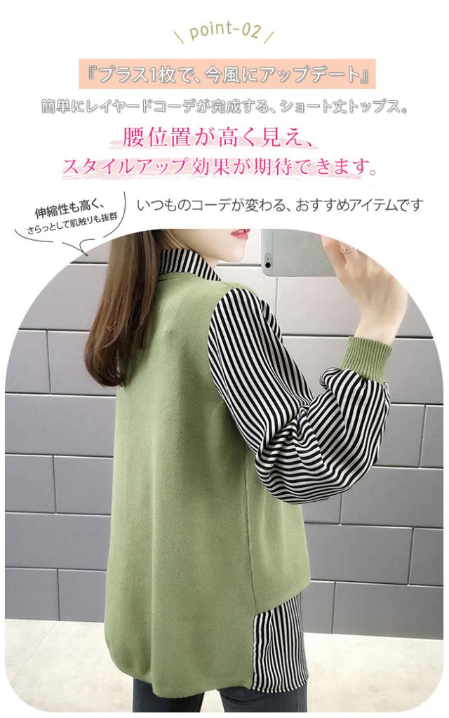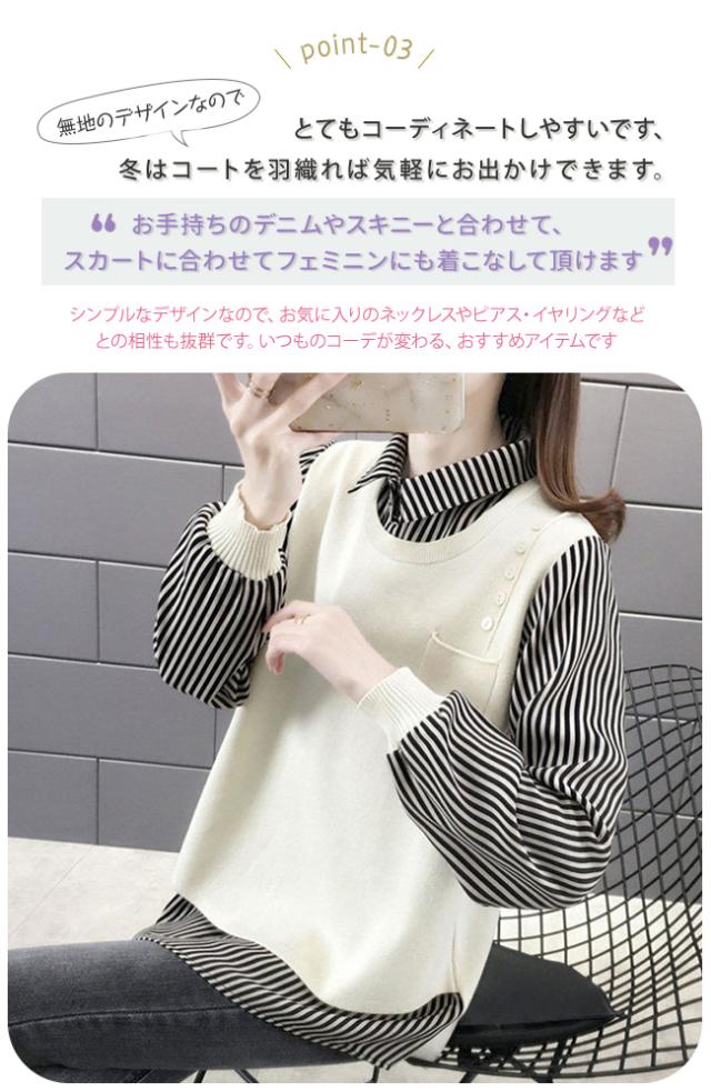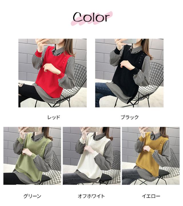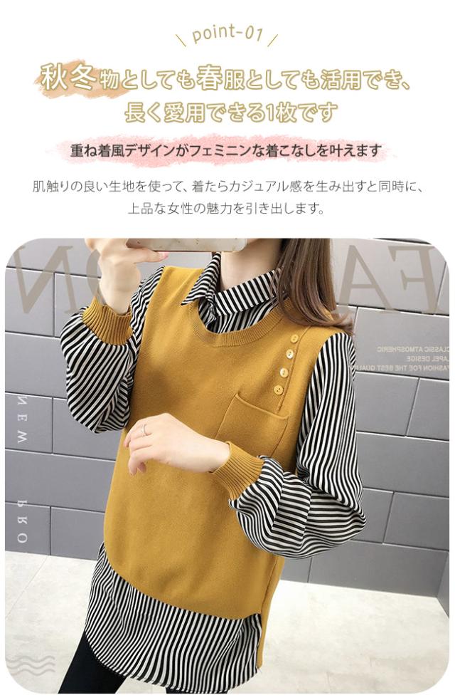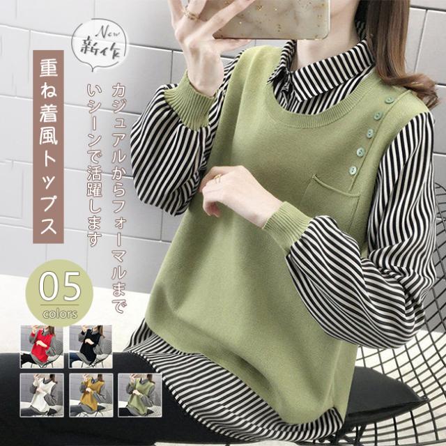 重ね着風 トップス レディース ニットベスト 春 秋 チュニック 異素材 ミックス レイヤード風 ストライプ ブラウス シャツ長袖 襟付き