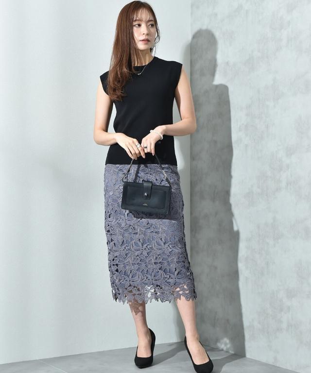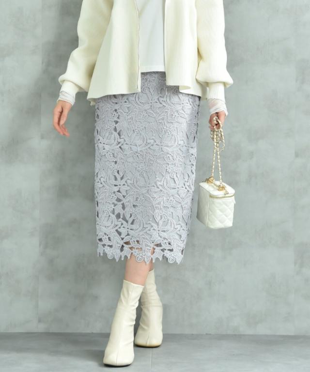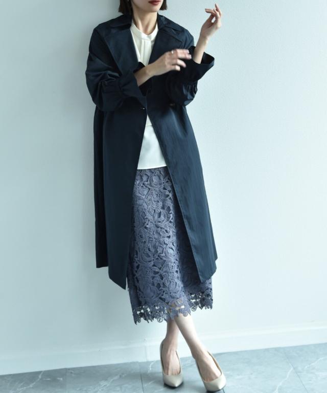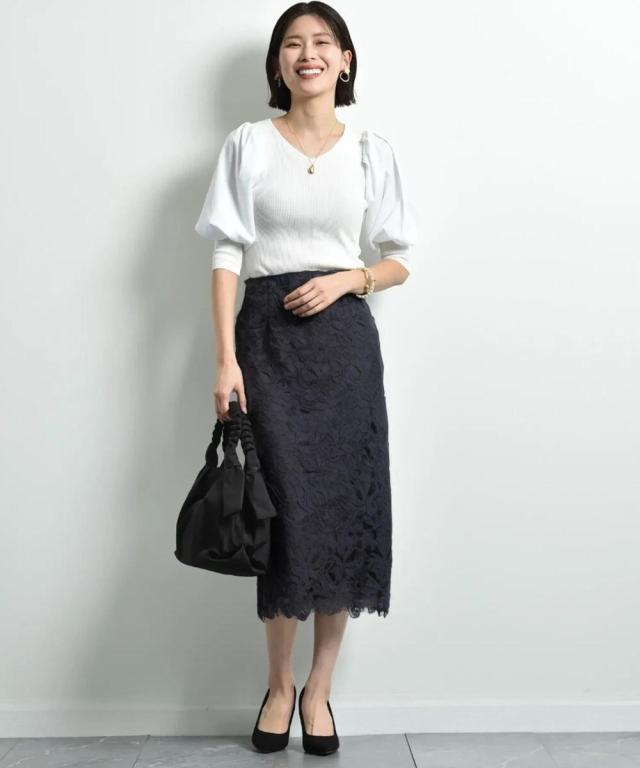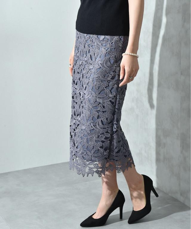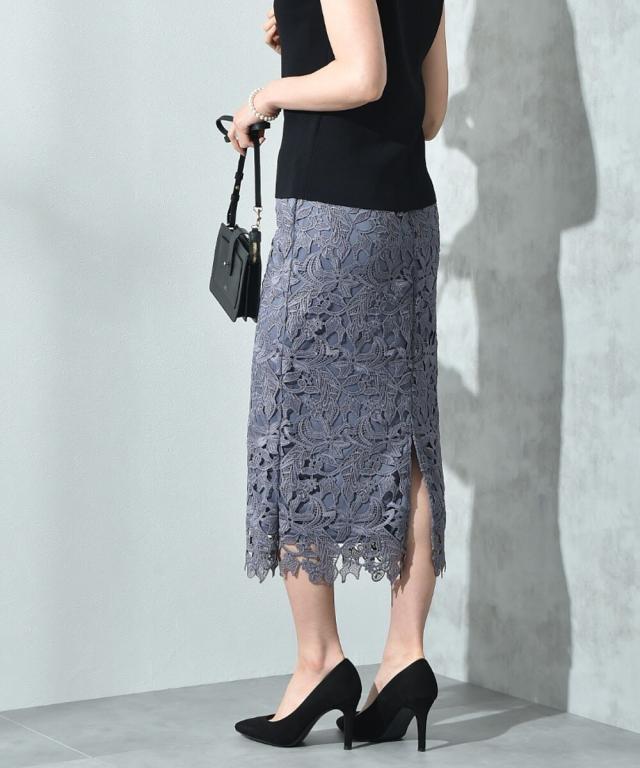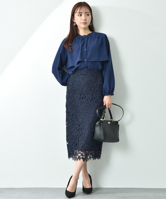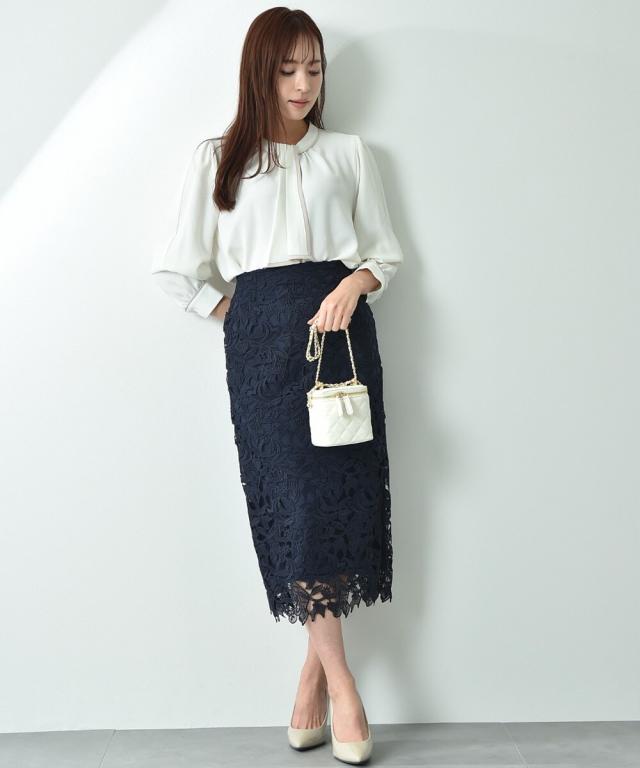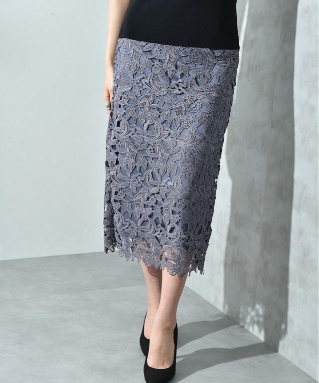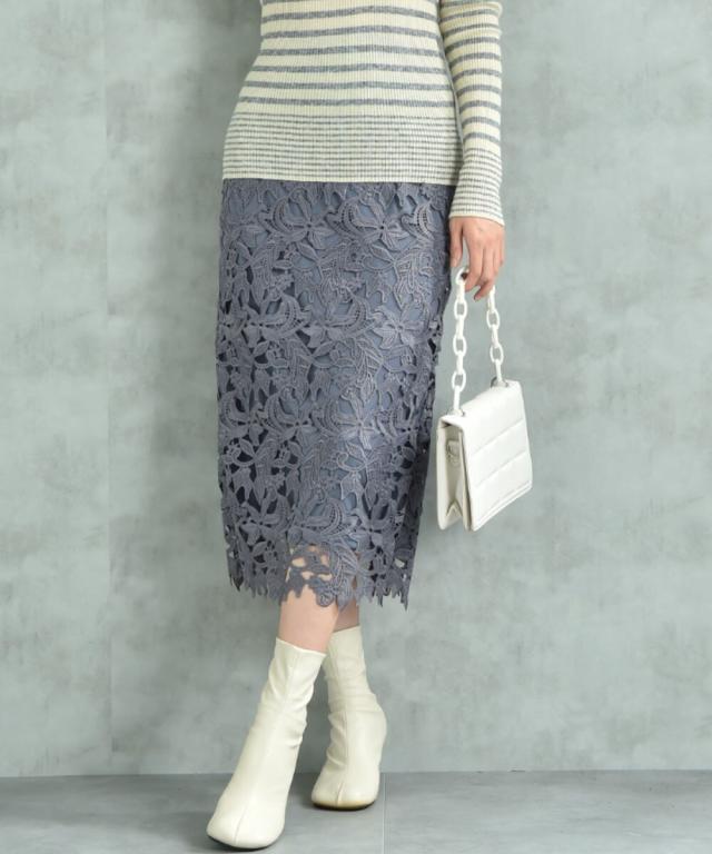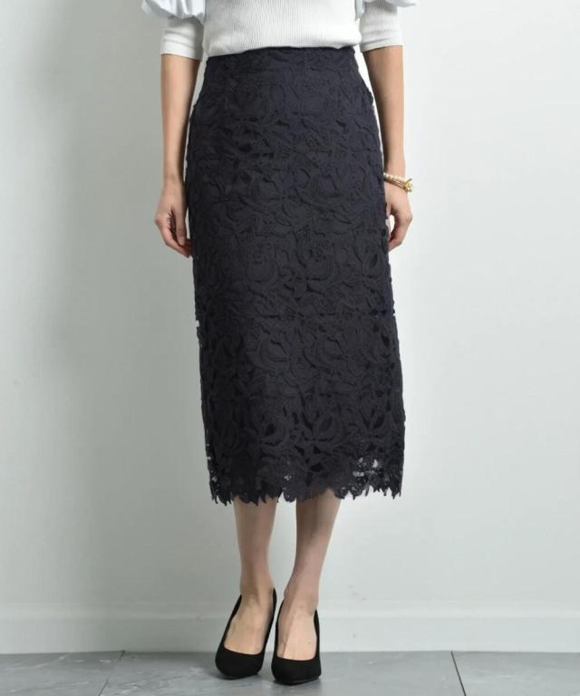 人気のレーススカートに新色が仲間入り!優しいネイビーはより上品な印象に演出してくれるお勧めななカラーです。素材はケミカルレースを使用。高級感のある見え方が魅力です。