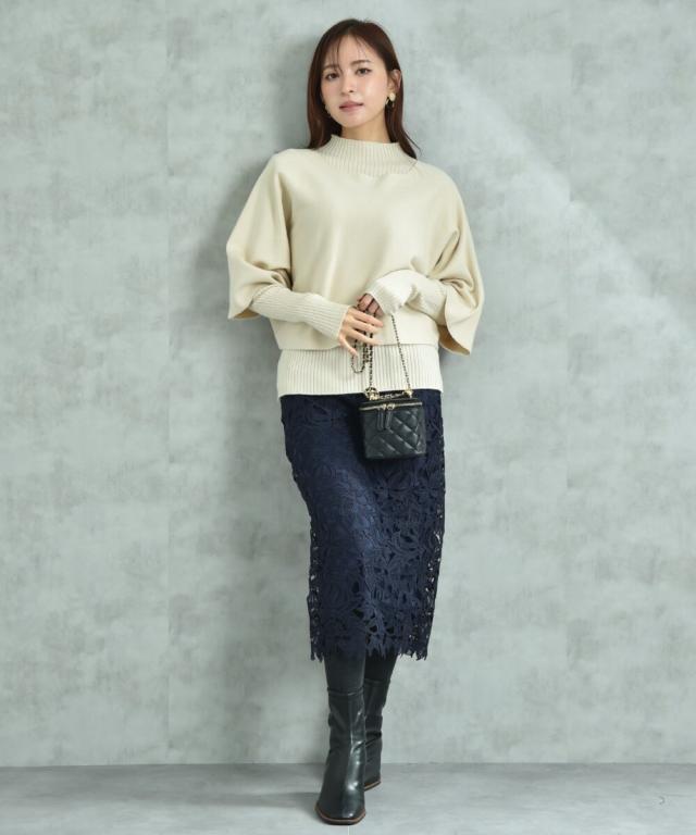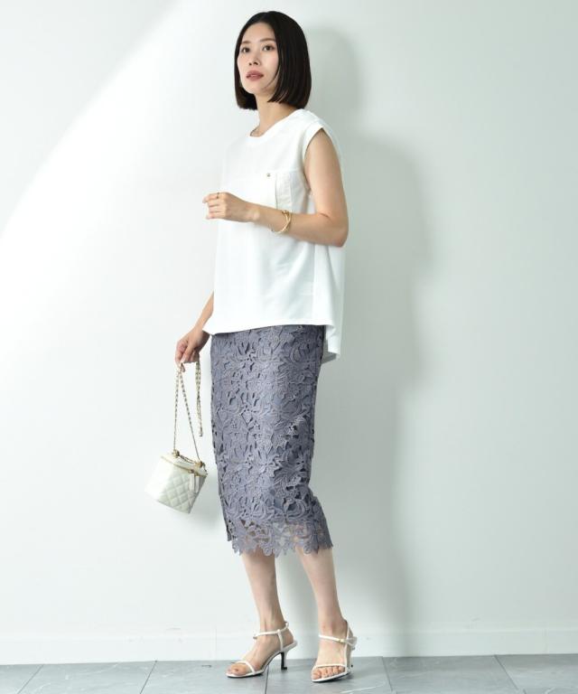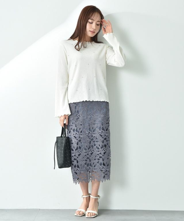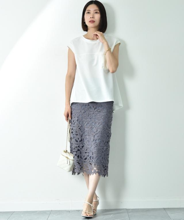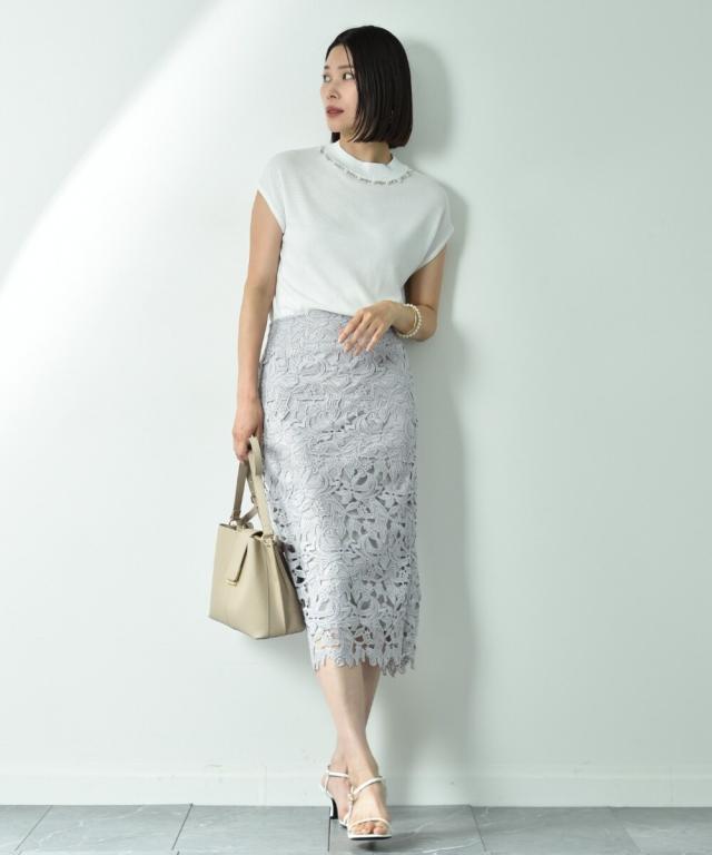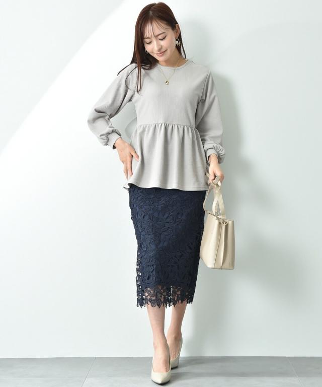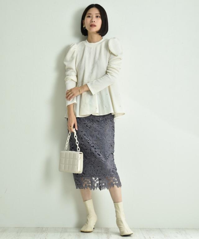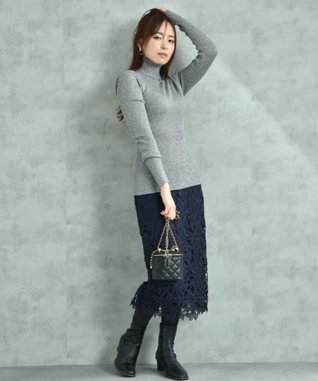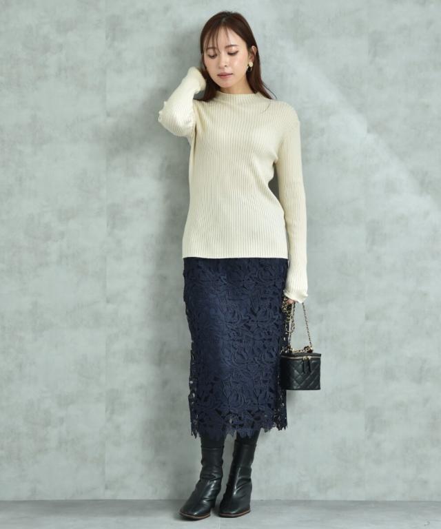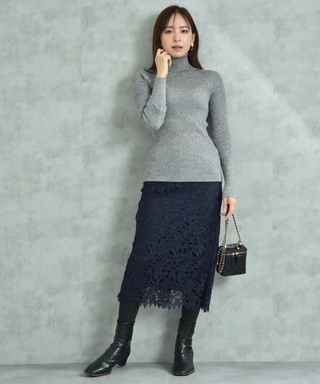 人気のレーススカートに新色が仲間入り!優しいネイビーはより上品な印象に演出してくれるお勧めななカラーです。素材はケミカルレースを使用。高級感のある見え方が魅力です。