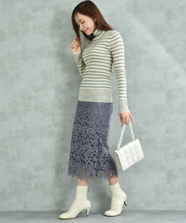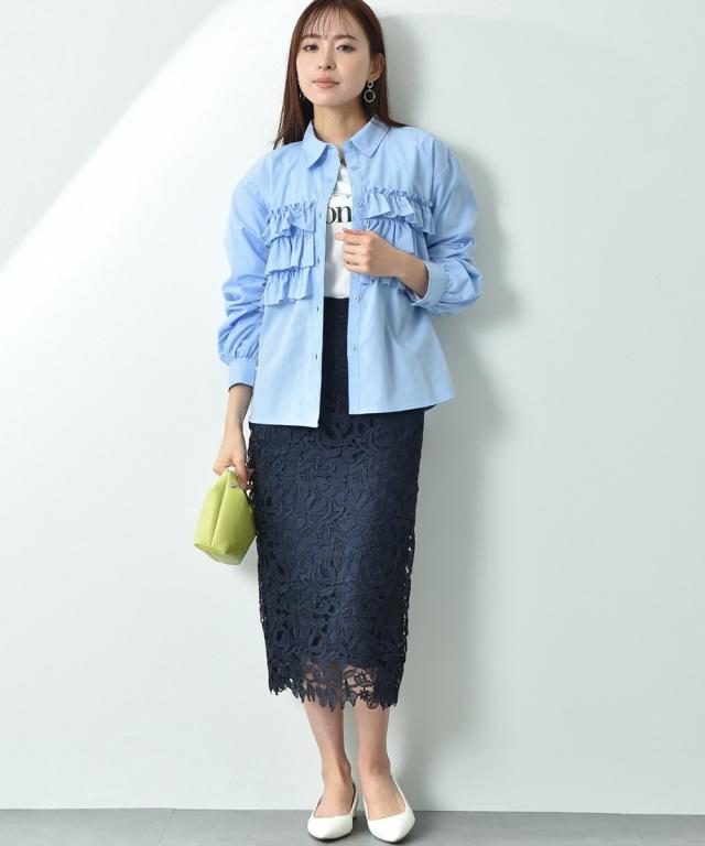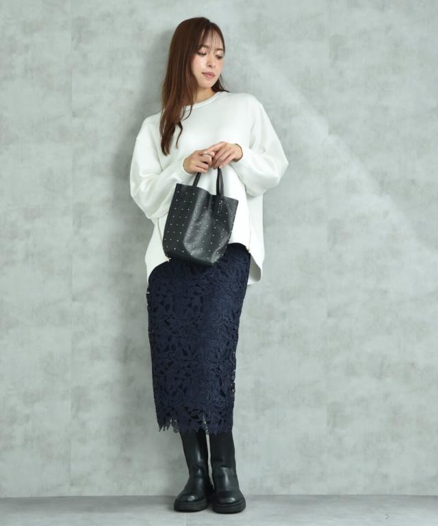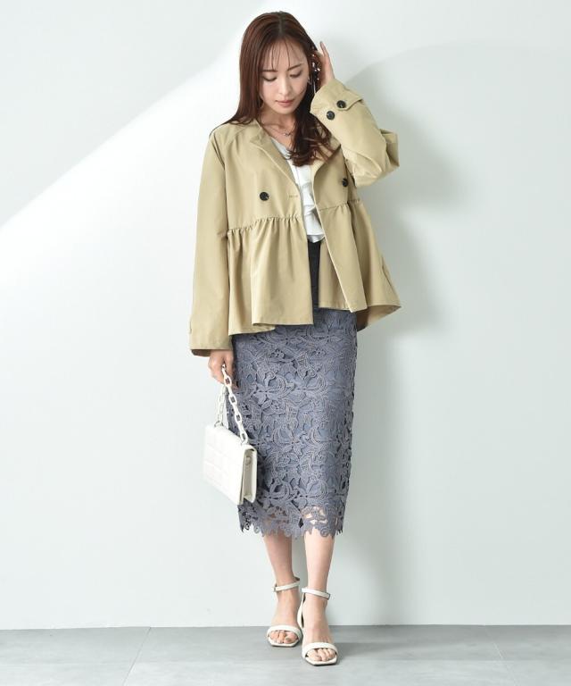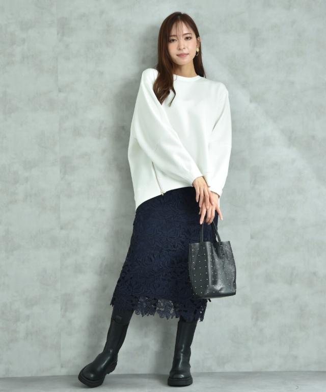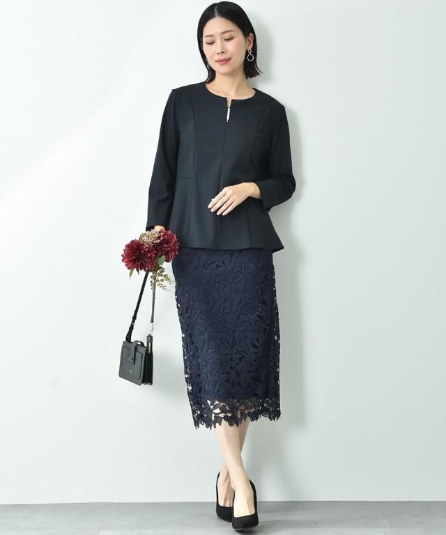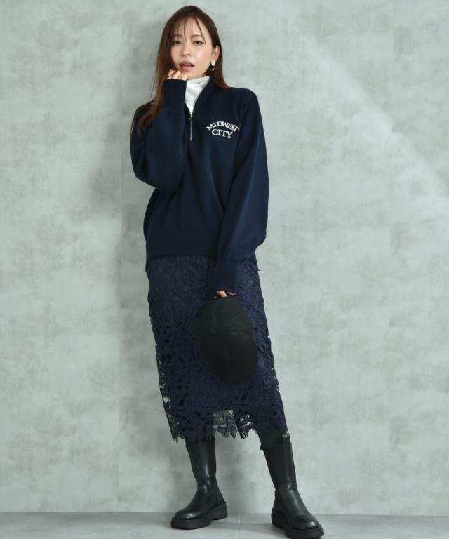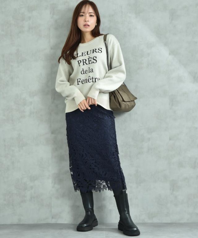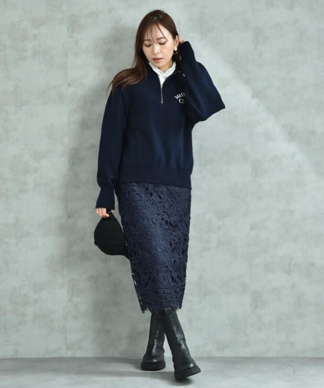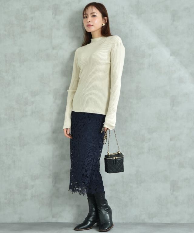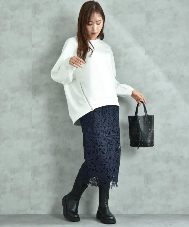人気のレーススカートに新色が仲間入り!優しいネイビーはより上品な印象に演出してくれるお勧めななカラーです。素材はケミカルレースを使用。高級感のある見え方が魅力です。