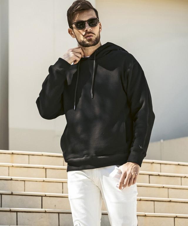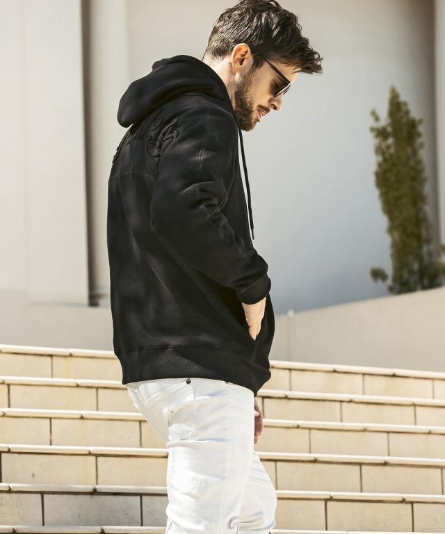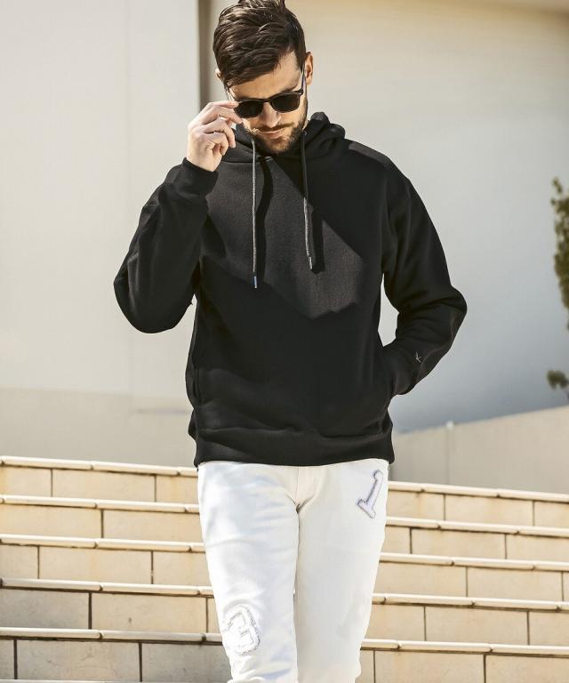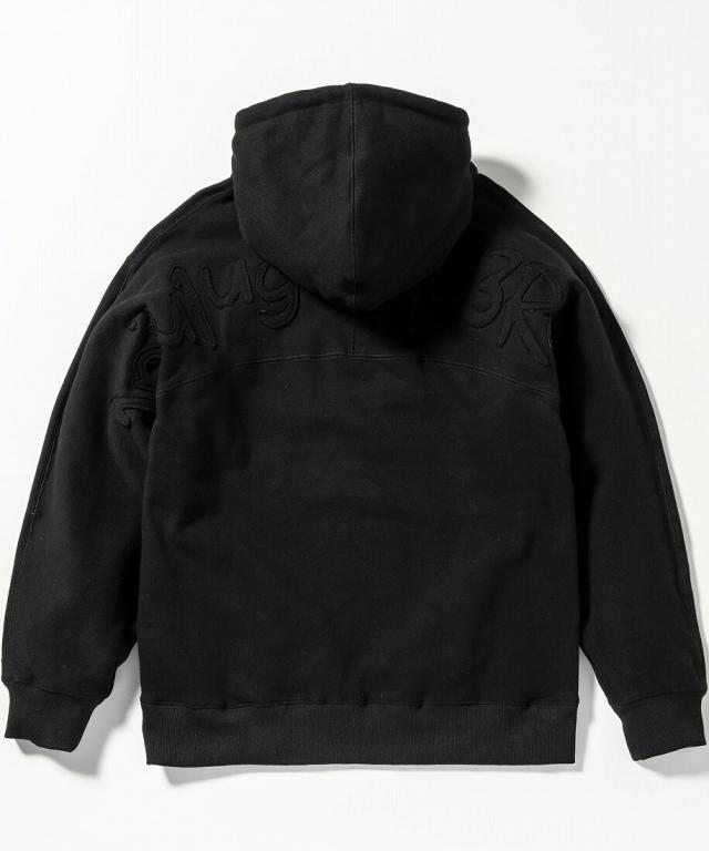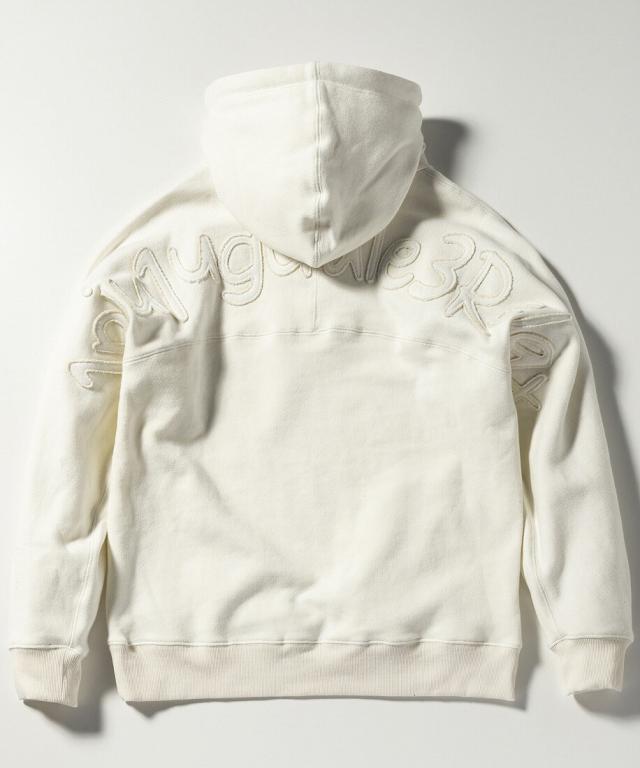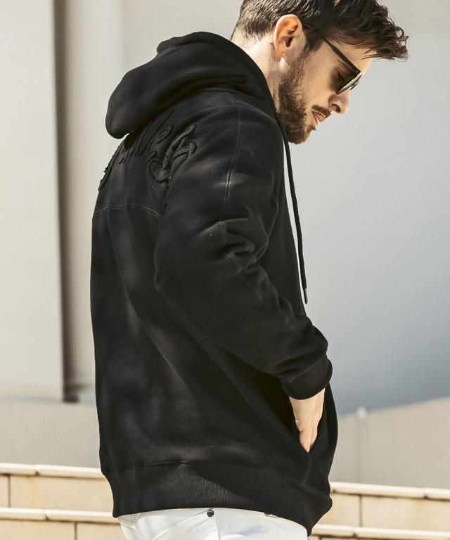 ヨーク部分に大胆にブランドロゴを配置したプルフーディー。