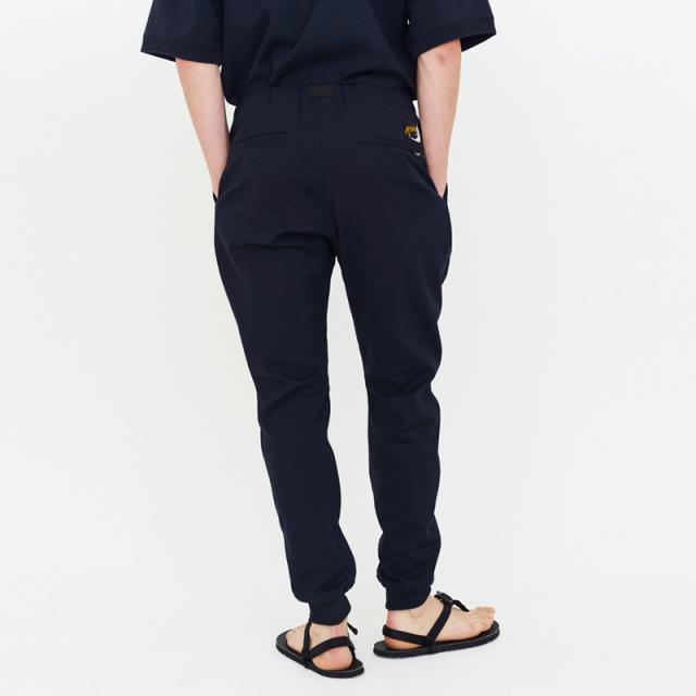 しなやかな肌触りと光沢感のあるコットンに、強度と速乾性に優れたナイロンをミックスした生地はストレッチ性も備えており、裾に向かってテーパードするスリムなシルエットにもかかわらず、窮屈さはなく快適な履き心地。