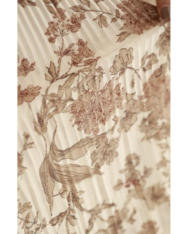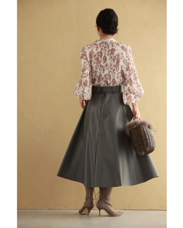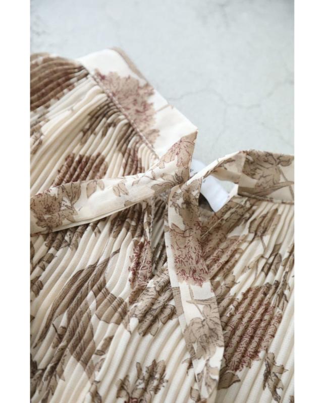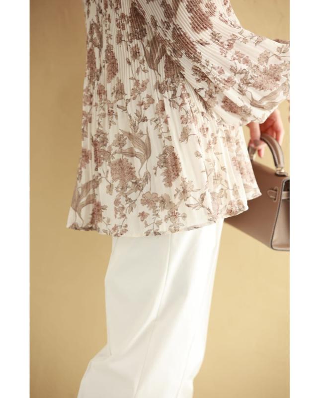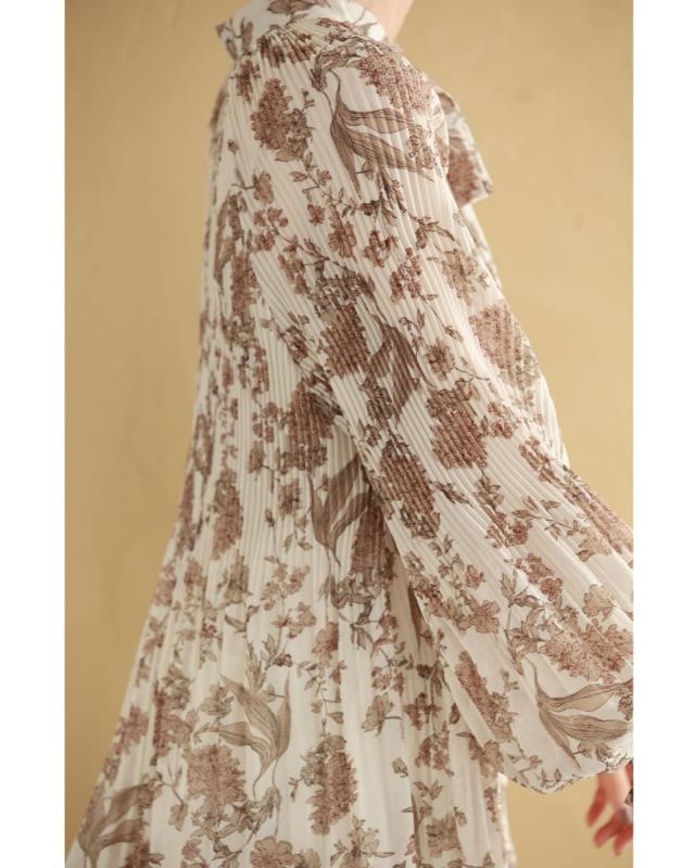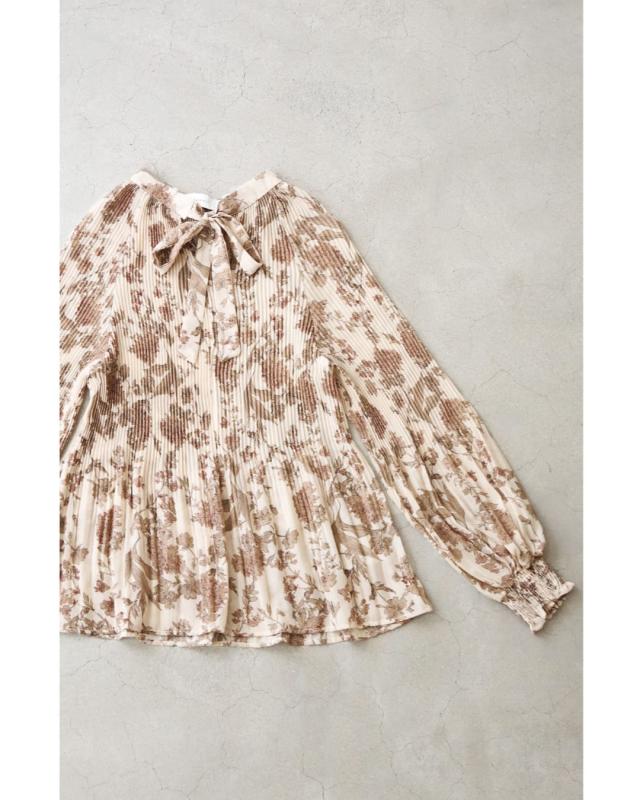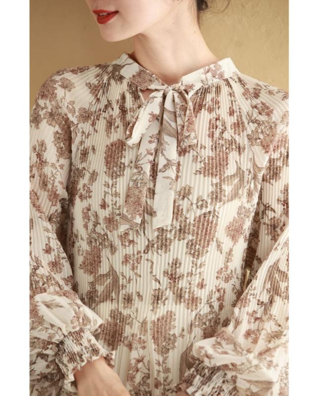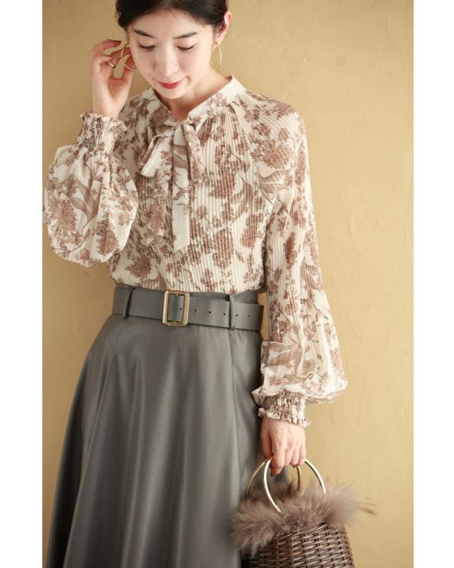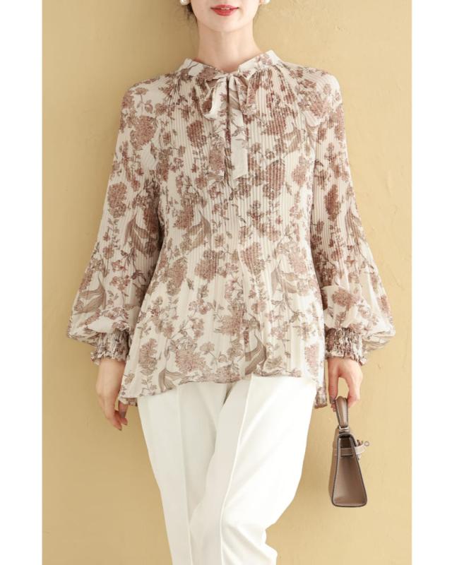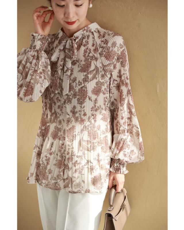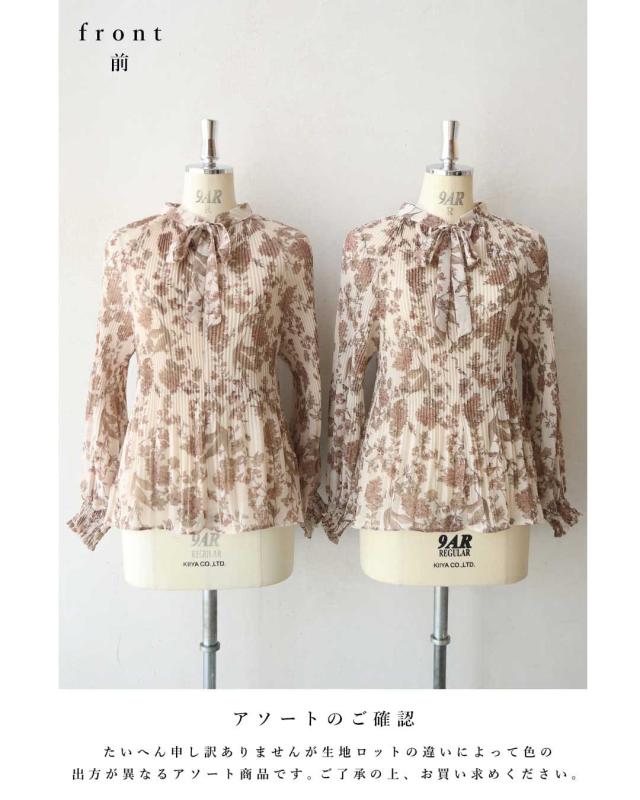 再入荷12月4日 ロマンティックな花柄の細やかプリーツブラウストップス cawaii wkj00106 春 秋 冬 着回し ポワン袖 エレガント 大人可愛い リボン アコーディオンプリーツ 透け感 レディース ファッション 大人 ミセス 30代 40代 50代