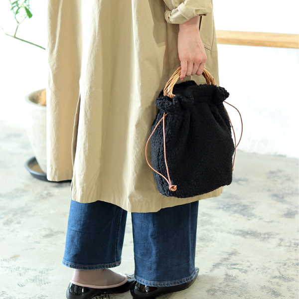 もこもことしたボア生地と三角の柳ハンドルを組み合わせました。