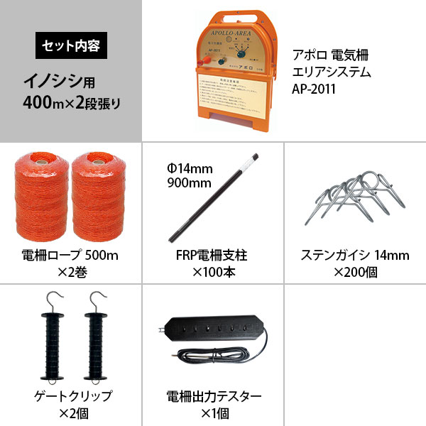 アポロ 電気柵 エリアシステム AP-2011 FRP支柱仕様 イノシシ用 400m×2段張りセット