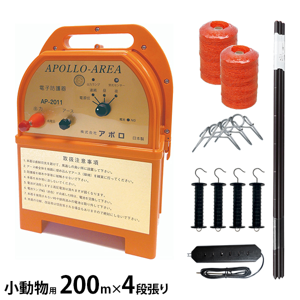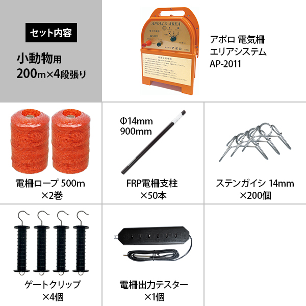 アポロ 電気柵 エリアシステム AP-2011 FRP支柱仕様 小動物用 (ハクビシン・アライグマ・タヌキ) 200m×4段張りセット