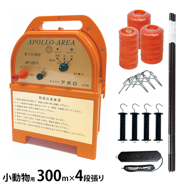 アポロ 電気柵 エリアシステム AP-2011 FRP支柱仕様 小動物用 (ハクビシン・アライグマ・タヌキ) 300m×4段張りセット
