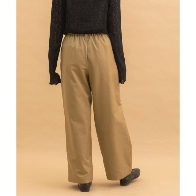 ・フロントベルト下にタックを取ったパンツ。微光沢の生地感がカジュアルにもきれいめにも使えて着こなしの幅を広げます。