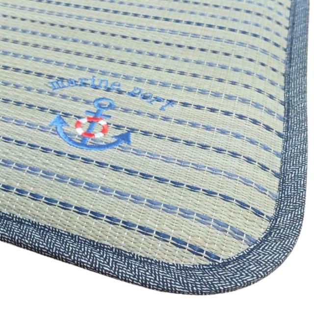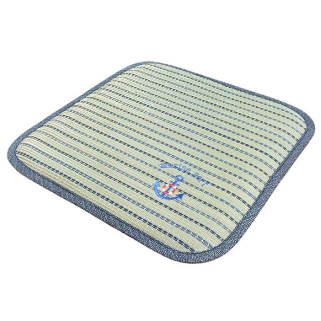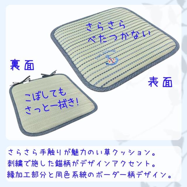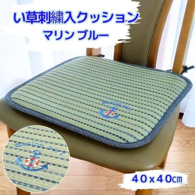 い草シートクッション マリン ブルー色 40x40cm 刺繍入り さらさら手触り 固定紐付き