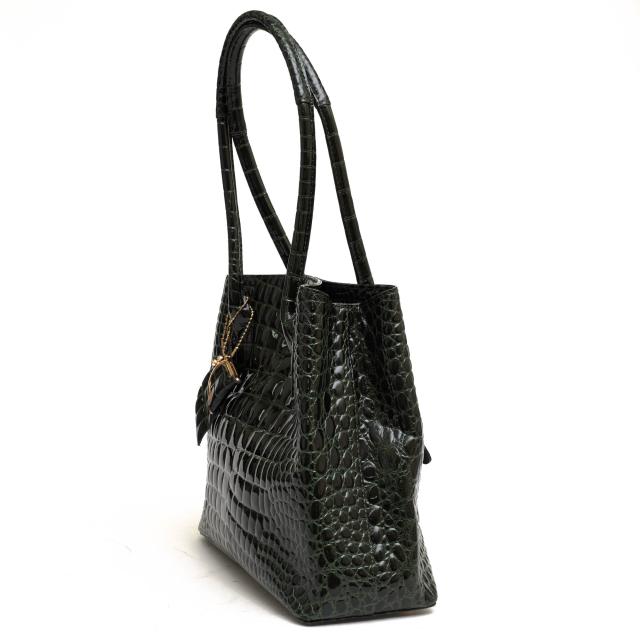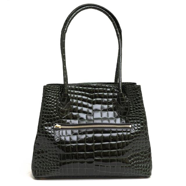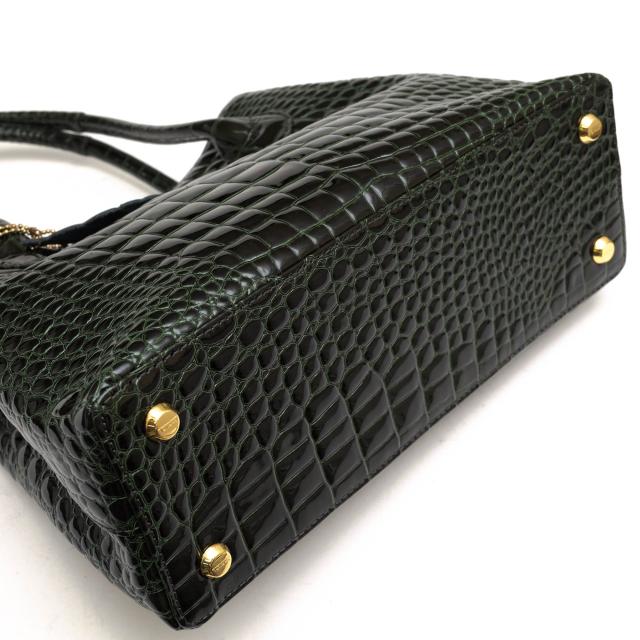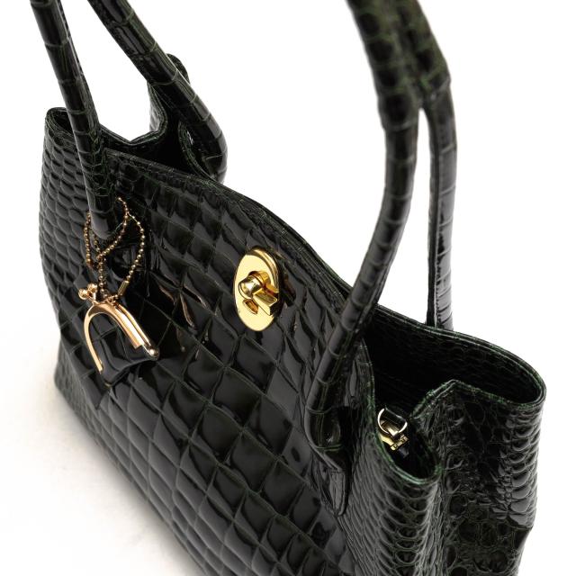 シャイニングエナメルレザーを使用した、日本の職人による手作りハンドバッグ。エレガントでゴージャスなポロサススモールクロコの型押し本牛革は、宝石のような輝きと優美な風合いを持つ素材。エレガントな持ち手と金具がアクセントとなっており、ヘリ返しの施されたボディは軽くてソフトな手触りです。持ち手は肩掛けができる長さで、ファスナー付きの仕切りと携帯・小物仕切りがあり、機能性も兼ね備えています。特殊なエナメル加工により、傷に強く、撥水性があり、日常使いにも適しています。大人のオシャレを楽しむ方におすすめの、スタイリッシュで独特な美しさを持つハンドバッグです。