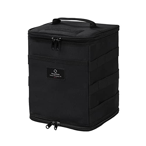 ・大容量、多機能オイルランタンおよびほかののオイルランタン、ガスタンク、コンロ、LEDランタン、シェラカップを含め、様々な製品が収納できます。内部には便利なマジックテープがあり、仕切りを自由に調節することができます。そして、メッシュポケットを内蔵し、ぶら下げ可能のリボンがあり、より多くのキャンプ用品を収納できます