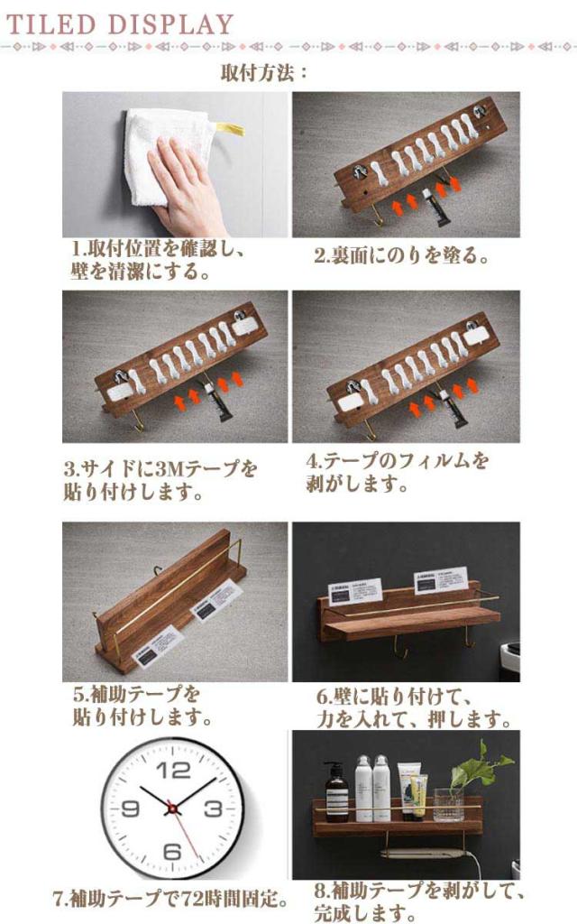 | 小物収納できる棚付き、便利な天然木のタオルハンガー。 ヴィンテージ感のある天然木が洗面所やトイレ、キッチンなどの水回りの印象をおしゃれに演出します。 キッチンで調味料、洗面所でシャンプーや化粧品、観賞植物などいろいろな物が置けます。 無駄のないスリムなデザインでタオルの取り換えも簡単。 キッチンやトイレなどで水に濡れてもサッとひと拭きでOK。 取付方法: 1.取付位置を確認し、壁を清潔にする。 2.裏面にのりを塗る。 3.サイドに3Mテープを貼り付けします。 4.テープのフィルムを剥がします。 5.補助テープを貼り付けします。 6.壁に貼り付けて、力を入れて、押します。 7.補助テープで72時間固定。 8.補助テープを剥がして、完成します。 | |