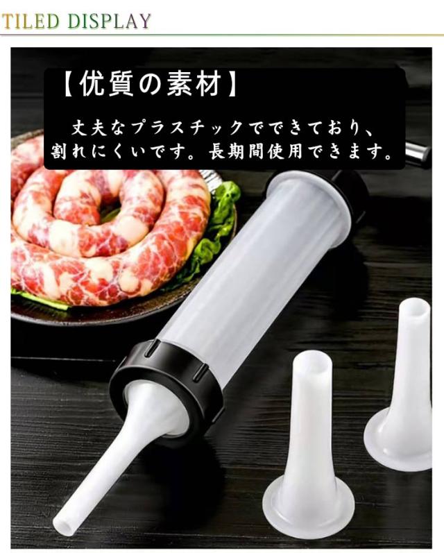 | 自宅で簡単に新鮮な異なるサイズのソーセージやサラミを作ることができます。 【各種チューブをご用意 】ニーズに合わせて、3つのチューブをご用意様!自宅で簡単に新鮮なソーセージを作ります。 【?質の素材】丈夫なプラスチックでできており、割れにくいです。長期間使用できます。 【お手入れ簡単】回転パーツと浣腸チューブを取り外すことができます。水洗い可能でお手入れも簡単にできます。 【簡単な操作&保管が簡単】ハンドルを押すと、肉が押し出されるので取り扱いが簡単。小型で軽量、コンパクトで省スペースで、持ち運びや保管に便利です。 【適合種類】肉、スクイズ麺、灌漑ソーセージ、野菜などに幅広くお使いいただけます。 | |