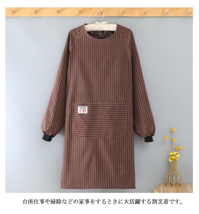 | 台所仕事や掃除などの家事をするときに大活躍する割烹着です。 ゴム入りの袖で家事もラクラク! 窮屈感のない着心地で、動きやすさも抜群。 ポケット付きで収納便利です。 サッとかぶり腰ヒモを結ぶだけで脱着可能。 お料理や家事用のエプロンとしてはもちろん、ガーデニング時などにも活躍。 | |