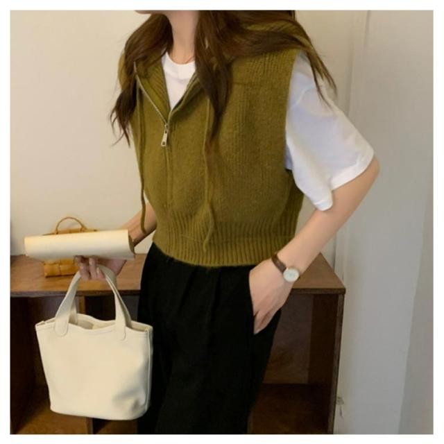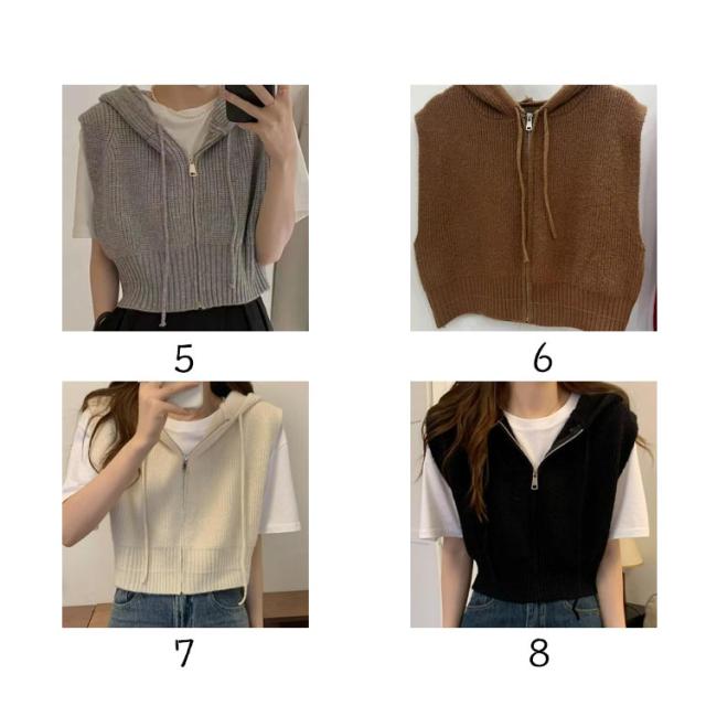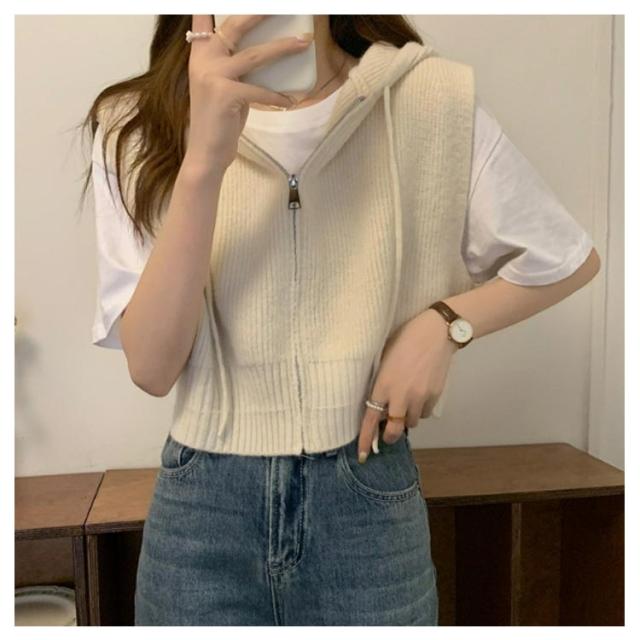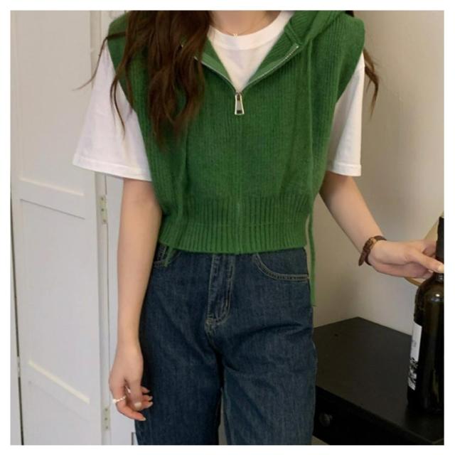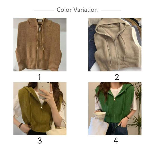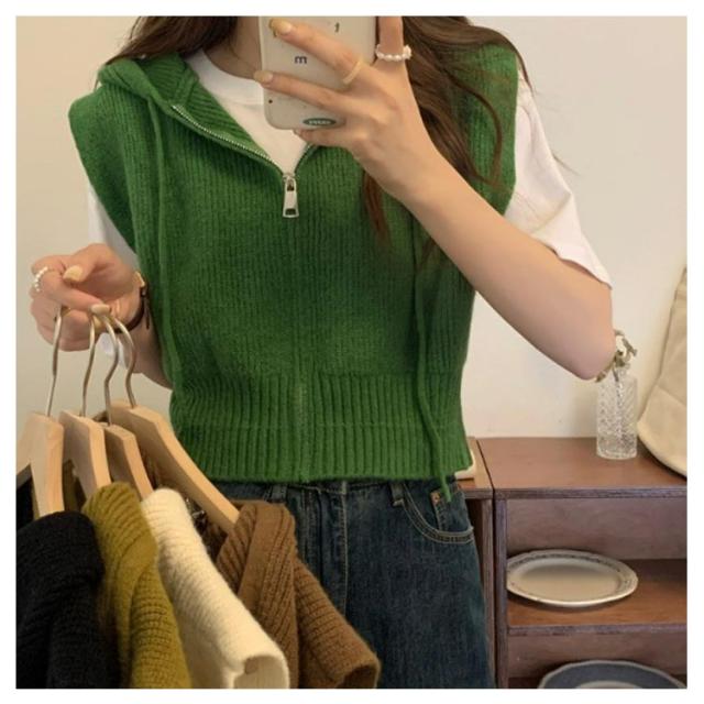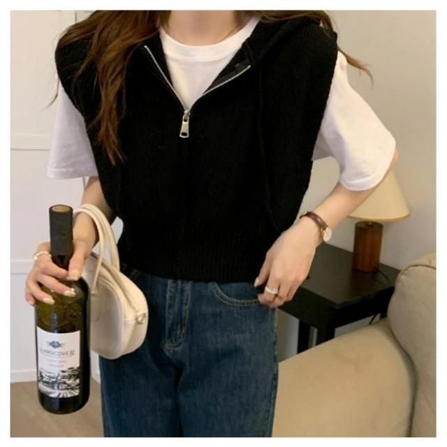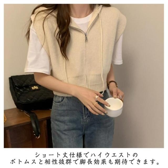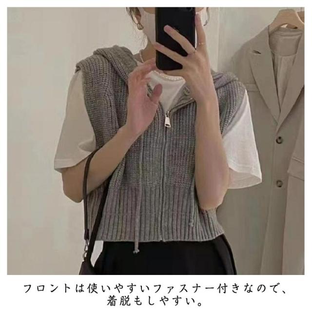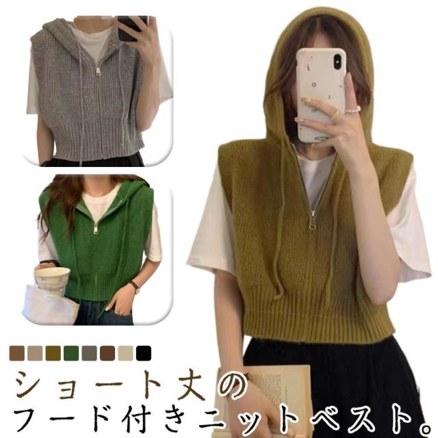 ショート丈 レディース パーカーベスト フード付き ニットパーカー カジュアル トップス ニット ベスト 前開き パーカーベスト ファスナー 通勤 通学 20代 30代