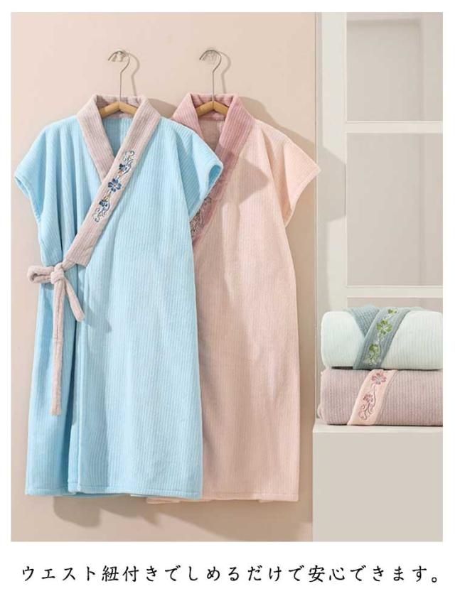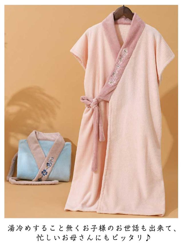 | ふわふわで気持ちよく、吸水性抜群なお風呂上がりウエア。 ウエスト紐付きでしめるだけで安心できます。 湯冷めすること無くお子様のお世話も出来て、忙しいお母さんにもピッタリ♪ リラックスタイムのルームウェアでパジャマとしての使用も◎ ゆったりとしたシルエットで体重40-70kgまでも対応できます。 | |