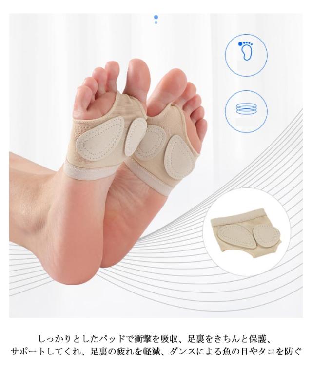 | 2双セット! 弾力性に優れ、通気性のよいメッシュで汗を吸収しムレにくい素材 しっかりとしたパッドで衝撃を吸収、足裏をきちんと保護、サポートしてくれ、足裏の疲れを軽減、ダンスによる魚の目やタコを防ぐ | |