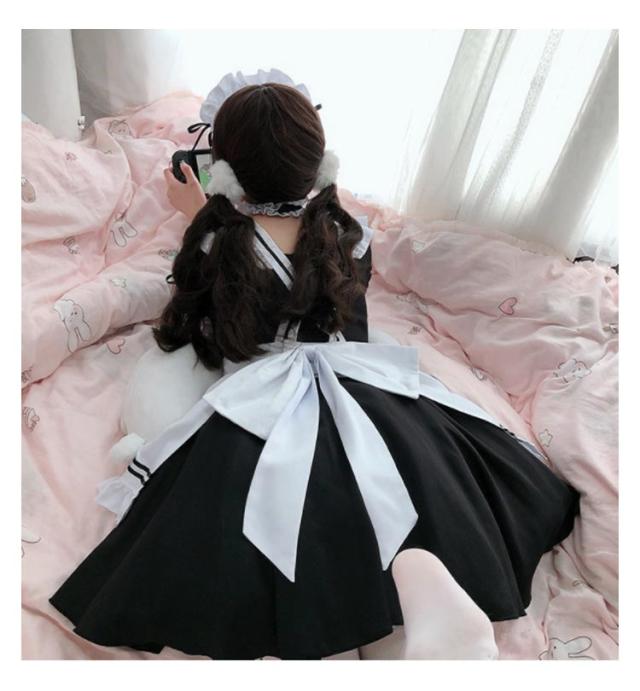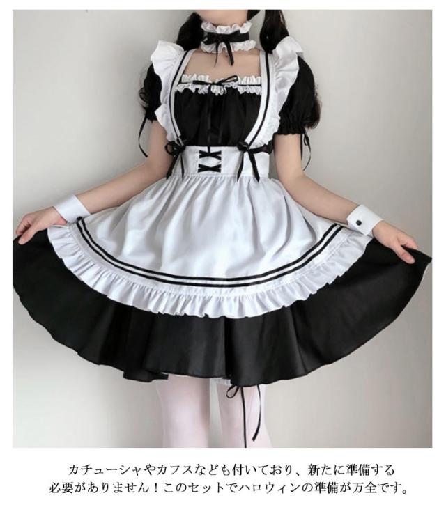 エプロン ワンピース 大人用 コスプレ 6点セット フリル かわいい かわいい ロリータ カチューシャ 付き メイド服 衣装 メイド服 コスチューム アニメ コスプレ衣装 ロリータワンピース エプロン 仮装パーティー 仮装 結婚式 余興 送料無料 黒 ブラック 白
