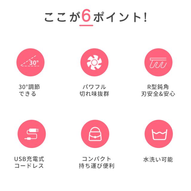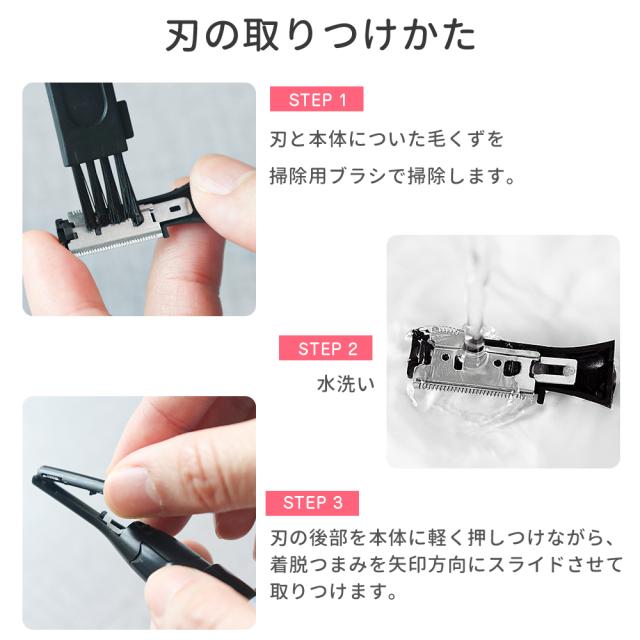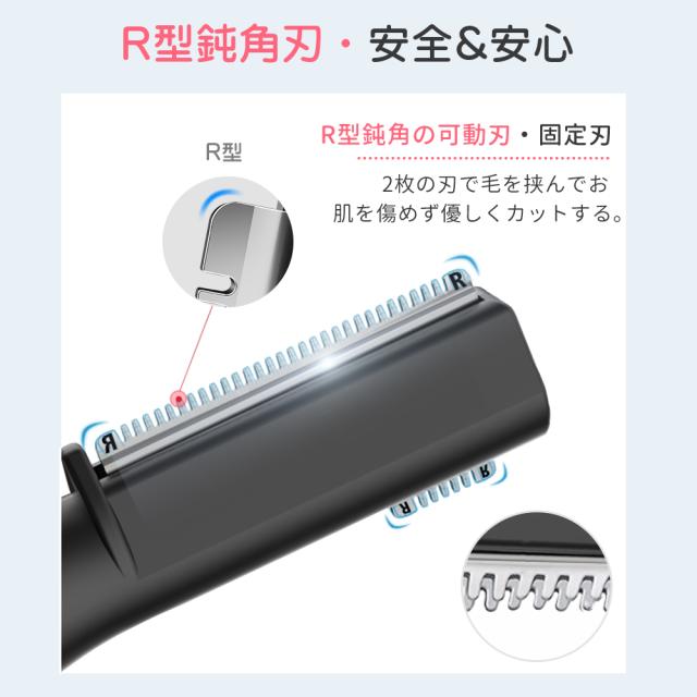 R型鈍角の可動刃・固定刃,2枚の刃で毛を挟んで,お肌を傷めず優しくカットする。