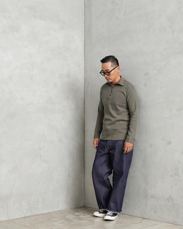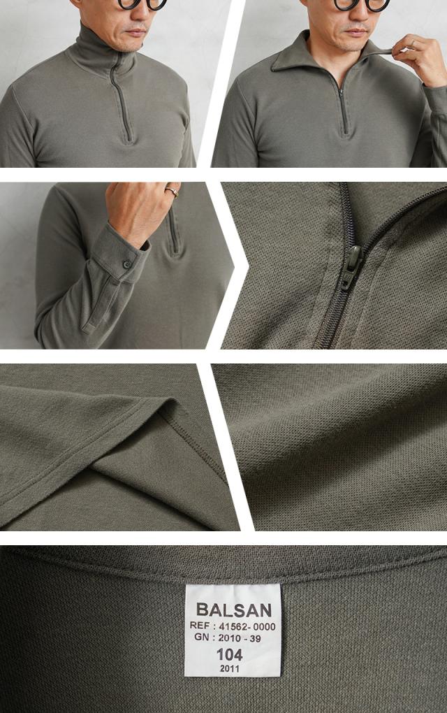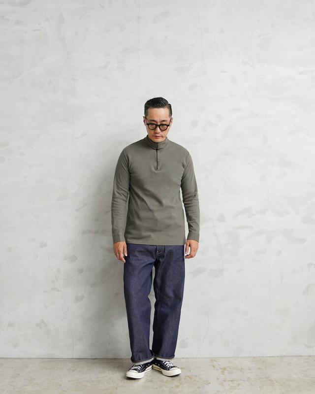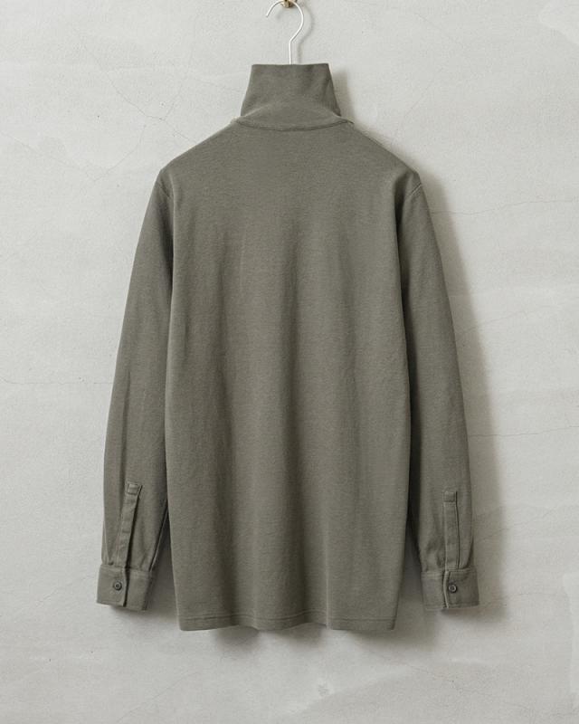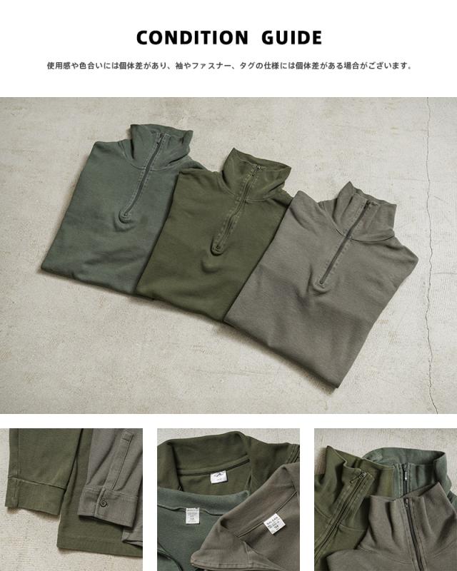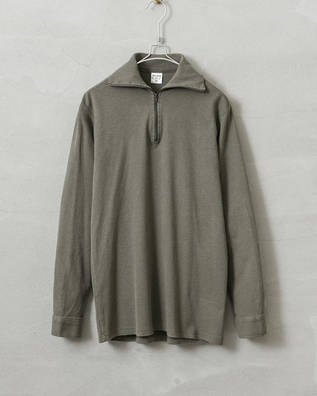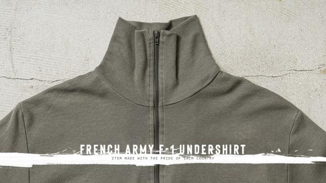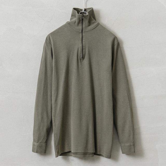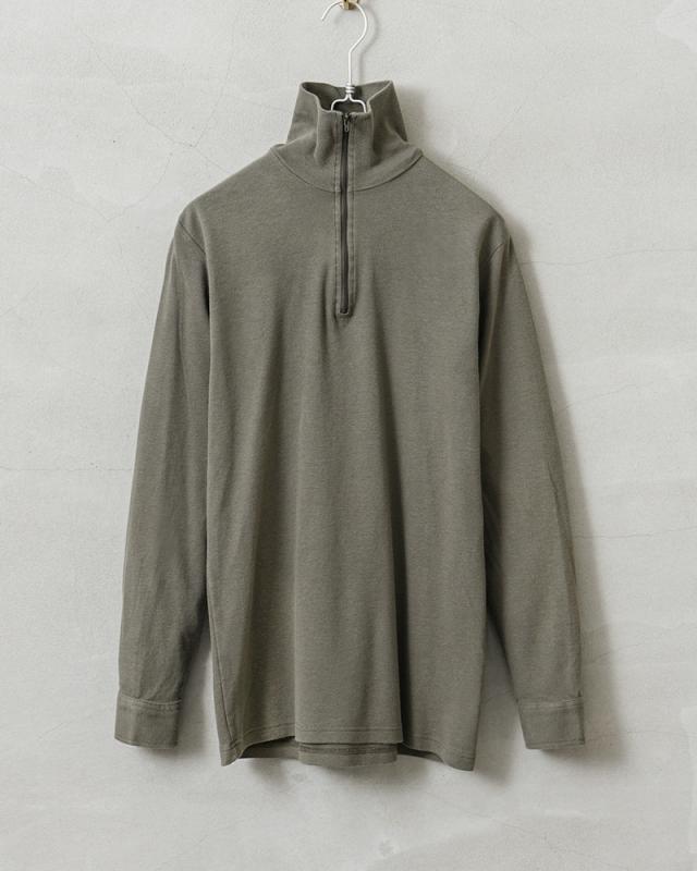 フランス軍からデッドストックで放出されたF-1アンダーシャツです。首元1/4ジップのプルオーバータイプで、綺麗なシルエットが特徴です。首元まで覆うスタンドカラーデザインなので、折りたたんでも着用ができ、様々な着こなしができるのもポイント。ドライタッチでアタリやフェード感が出た良い雰囲気。