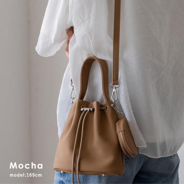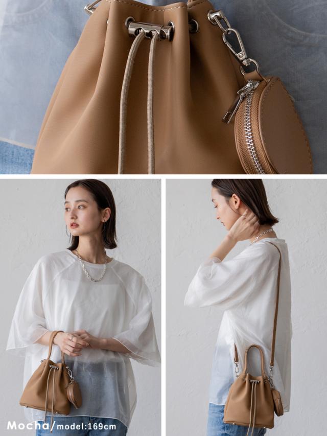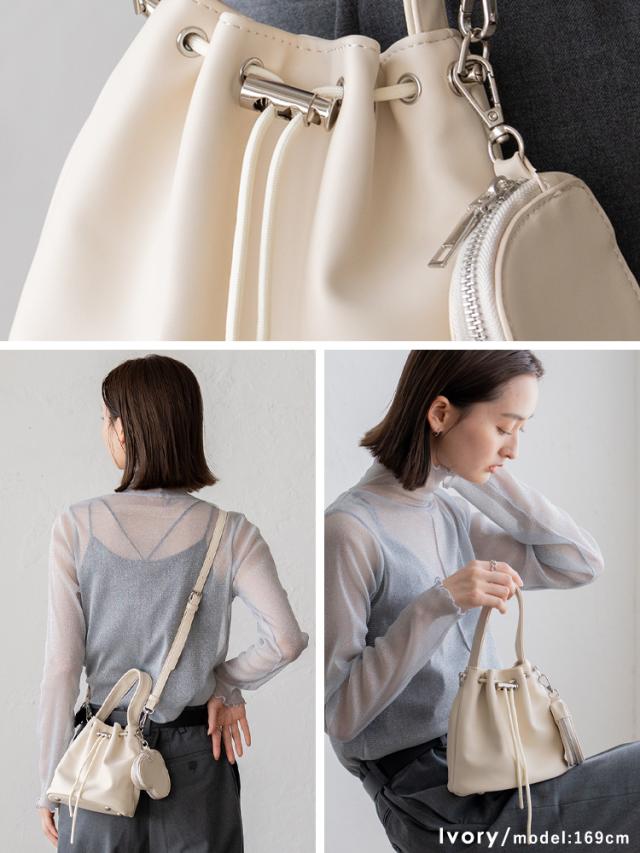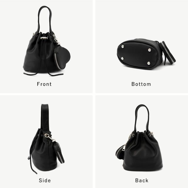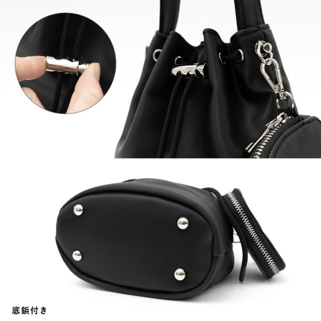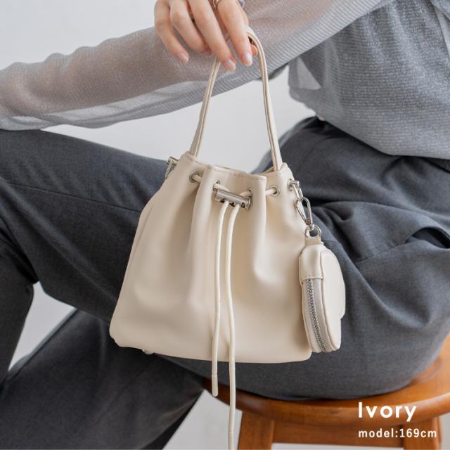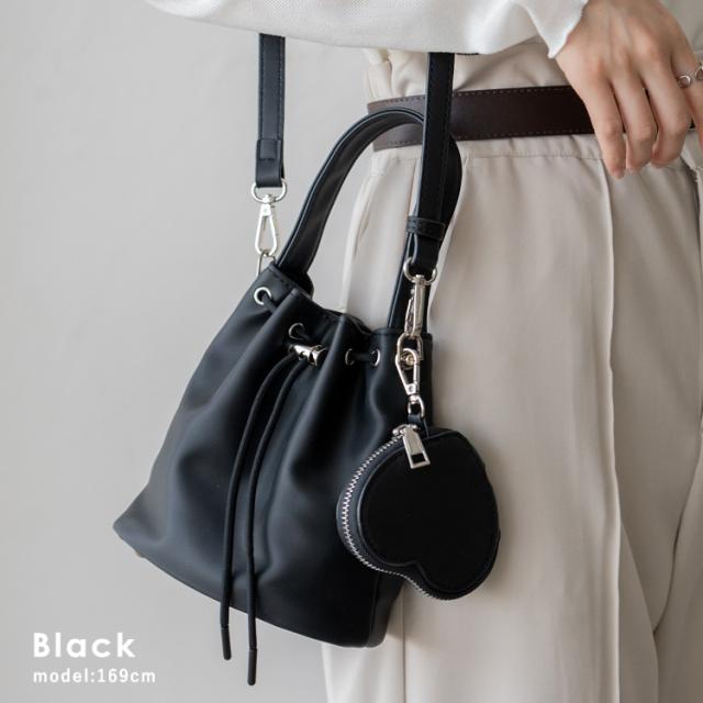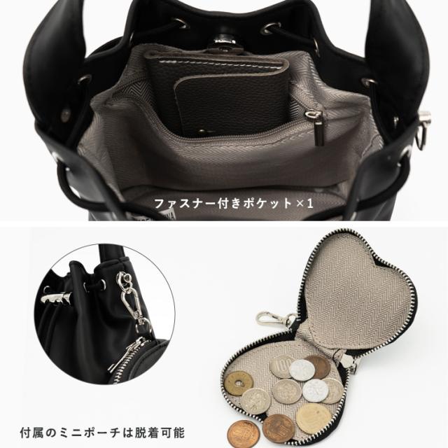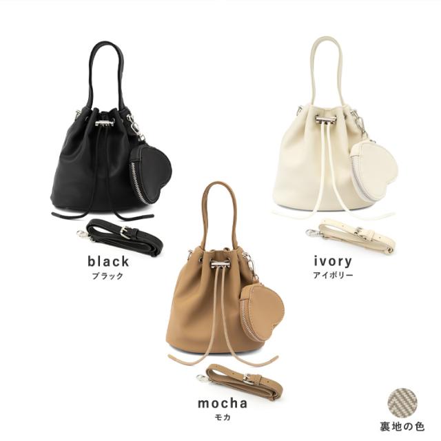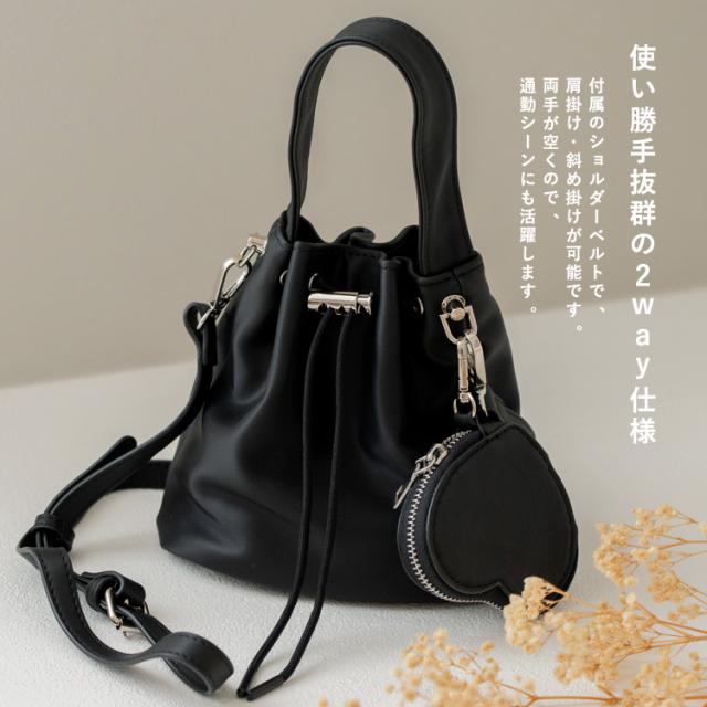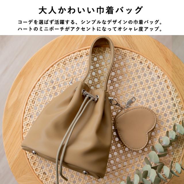 ハート形のポーチが付いたキュートで実用的な巾着ミニバッグ。