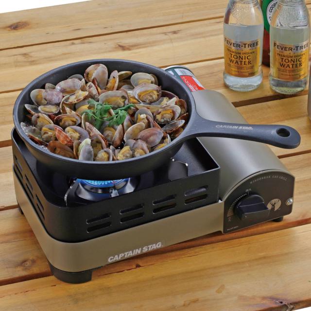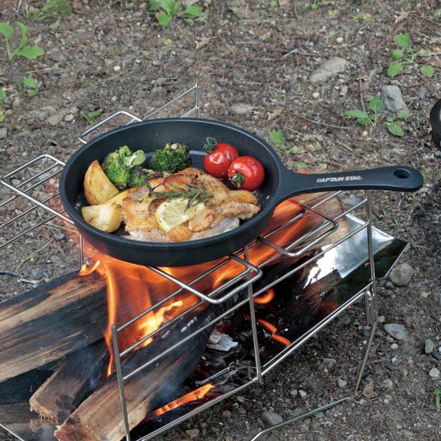 焚き火台の他、ジュニアタイプと通常カセットコンロでも手軽に使えます。スキレットであさりのワイン蒸しを作って、そのままテーブルに並べれば、おしゃれな演出ができます。肉料理との相性も抜群で、鮮やかな色彩の野菜を添えれば、映えること間違いなしです。