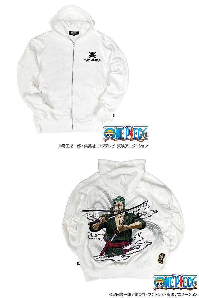 絡繰魂のONE PIECE コラボより新作登場!! コラボ限定描き下ろしの超貴重なデザインを今回はパーカーに落とし込み!! 背景には竜巻をプリントし、妖刀をも扱う男の覇気をイメージしたデザインは刺繍で表現! そして、ブランドロゴはゾロによって一刀両断! ゾロ限定「三刀流ピスネーム」が裾横に付属。 ゾロの鬼気迫る迫力を存分に表現した一着です! | |||||||||||||||||||||||||