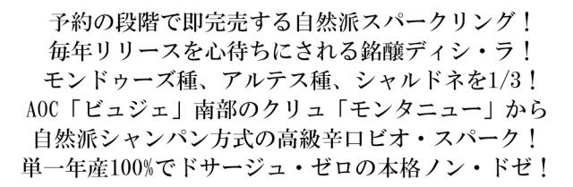 予約の段階で即完売する自然派スパークリング! 毎年リリースを心待ちにされる銘醸ディシ・ラ! モンドゥーズ種、アルテス種、シャルドネを1/3! AOC「ビュジェ」南部のクリュ「モンタニュー」から 自然派シャンパン方式の高級辛口ビオ・スパーク! 単一年産100%でドサージュ・ゼロの本格ノン・ドゼ!
