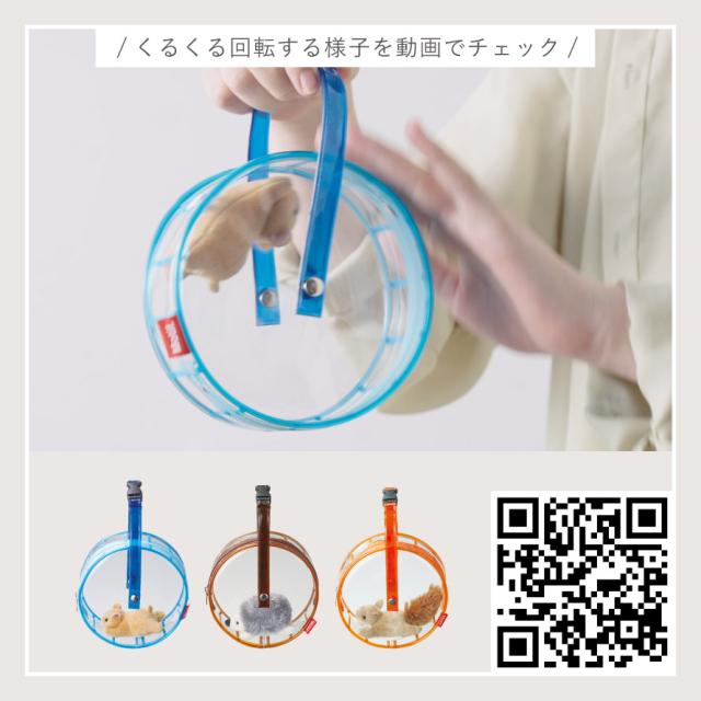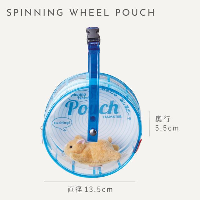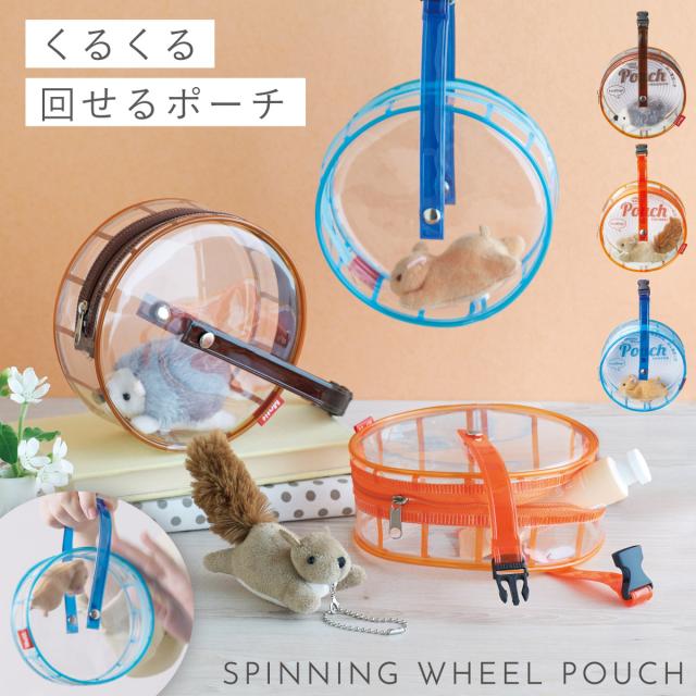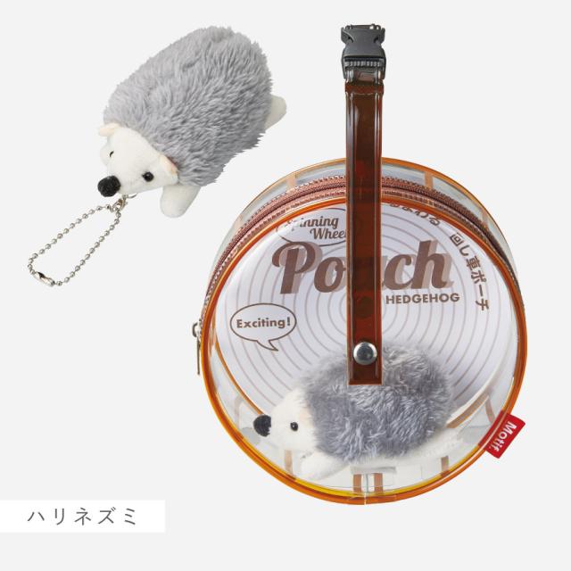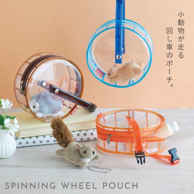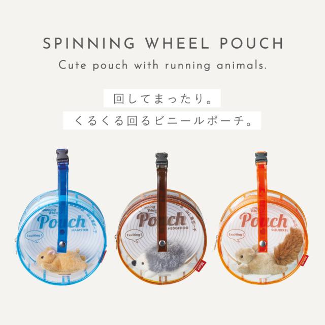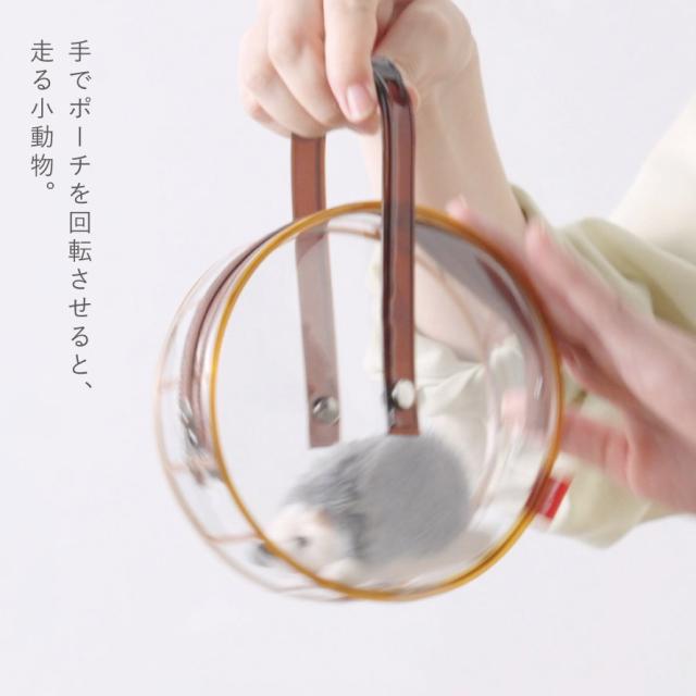 くるくる回してまったり。小動物たちが走る回し車モチーフのビニールポーチ。手でポーチを回転させると、走るハムスター、ハリネズミ、リス。なんとも癒される、くるくる回るユニークポーチ。