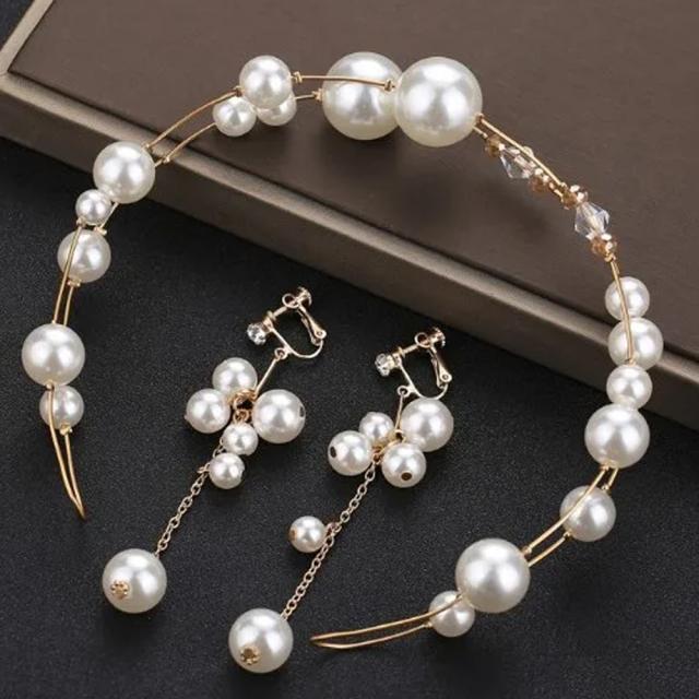 豪華なヘアバンドとイヤリングをセットにした結婚式や雑誌の撮影にぴったりのゴージャスなノンホールピアスピアスとヘアバンドのセットです。