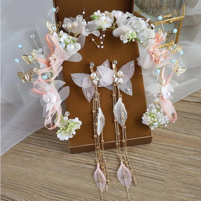 ガーデンバタフライヘアバンドとロングバタフライイヤリングセット 両耳 青色 ブルー 白色 ホワイト 花 フラワー 蝶 ちょう ゴールド 金色 揺れる 女性 レディース 結婚式 発表会 パーティ 入学式 二次会 ウエディングジュエリー プレゼント 成人式 ドレス 着物 カチューシュ