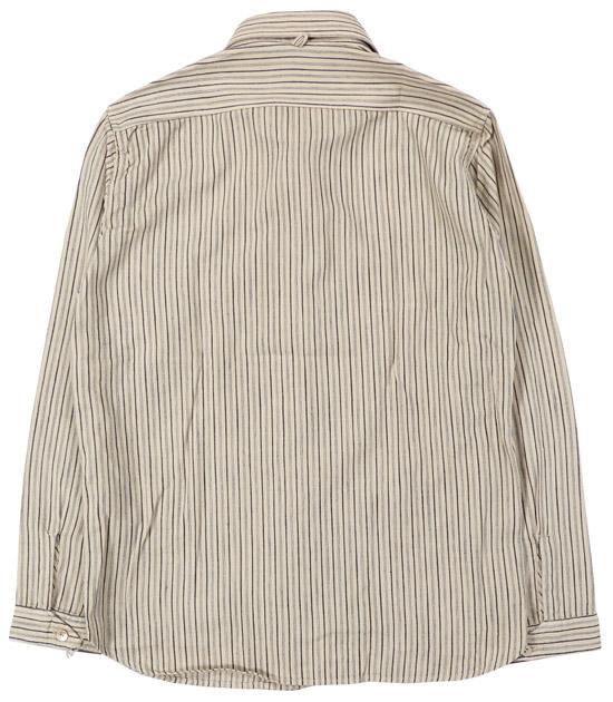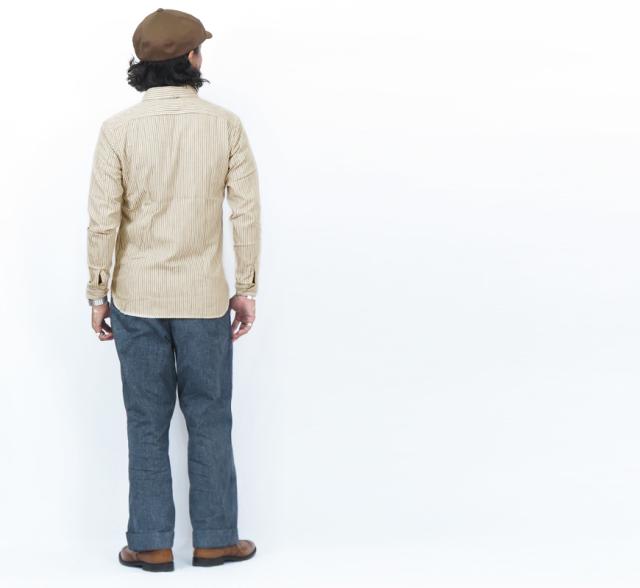 きなりベースの生地にインディゴストライプが映えるショールカラーのシャツは