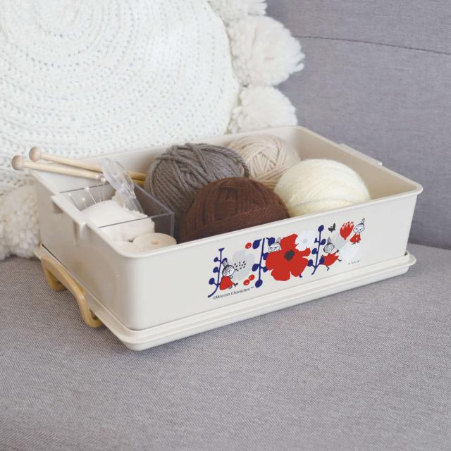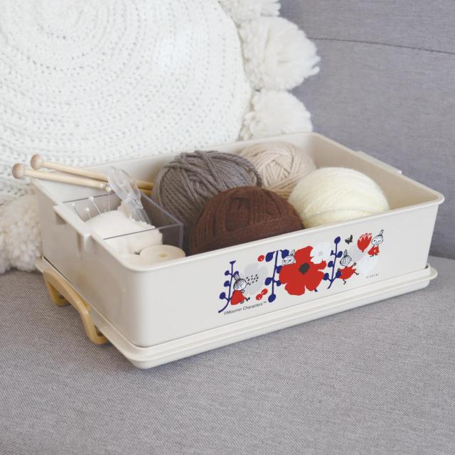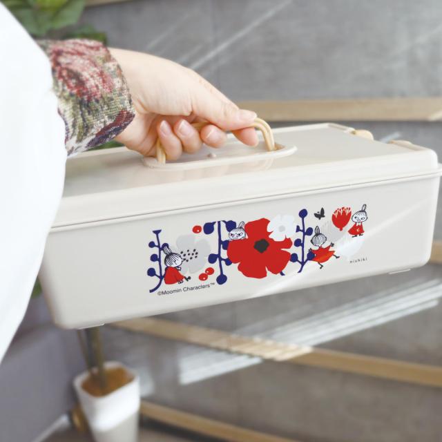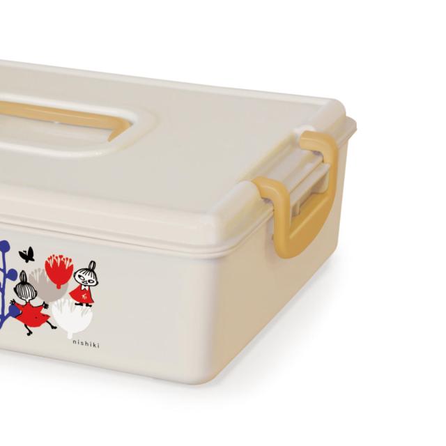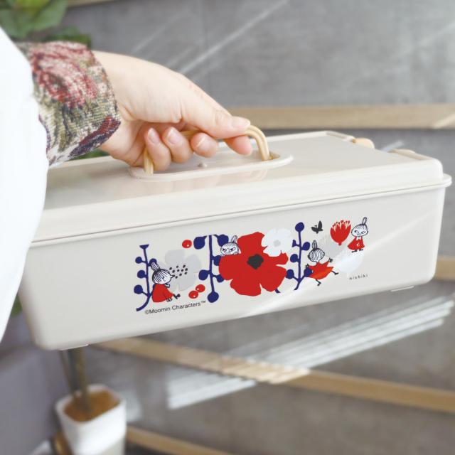 花と戯れるリトルミイがおしゃれでかわいいツールボックスです。フタを「パチッと」留めることができるので、簡単に中身が飛び出さず安心して収納できます。