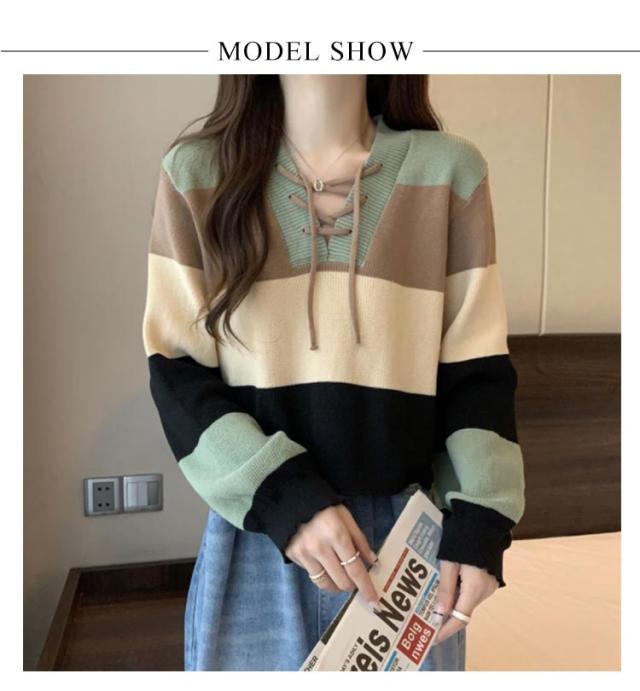 ニット セーター レディース スキッパー リボン Vネック ボーダーニット プルオーバー ニット セーター ニットトップス ニットプルオーバー ボーダーニット スキッパーニット セーター トップス 大人 かわいい レディース 韓国ファッション