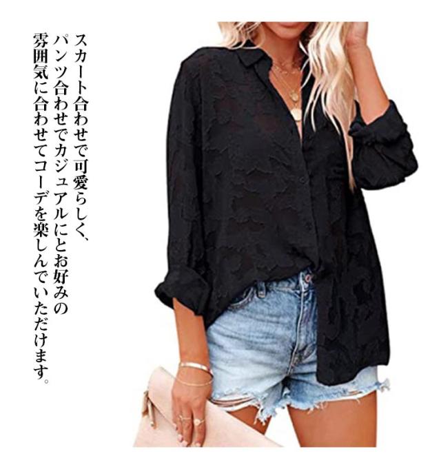 シアー シャツ ブラウス 白 長袖 黒 秋 春夏 ジャガード 花柄 透け感 オケージョン バルーンスリーブ オフィスカジュアル カジュアル 韓国ファッション ジャガードフラワーシアーシャツ